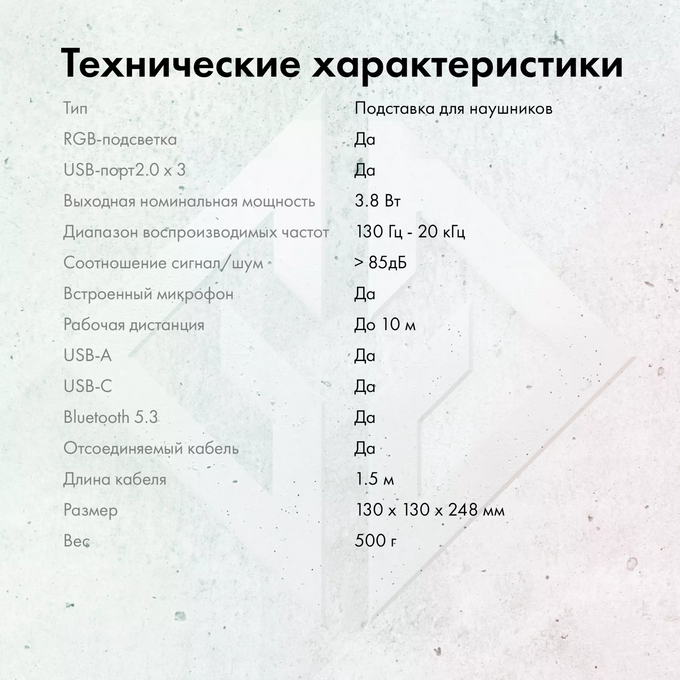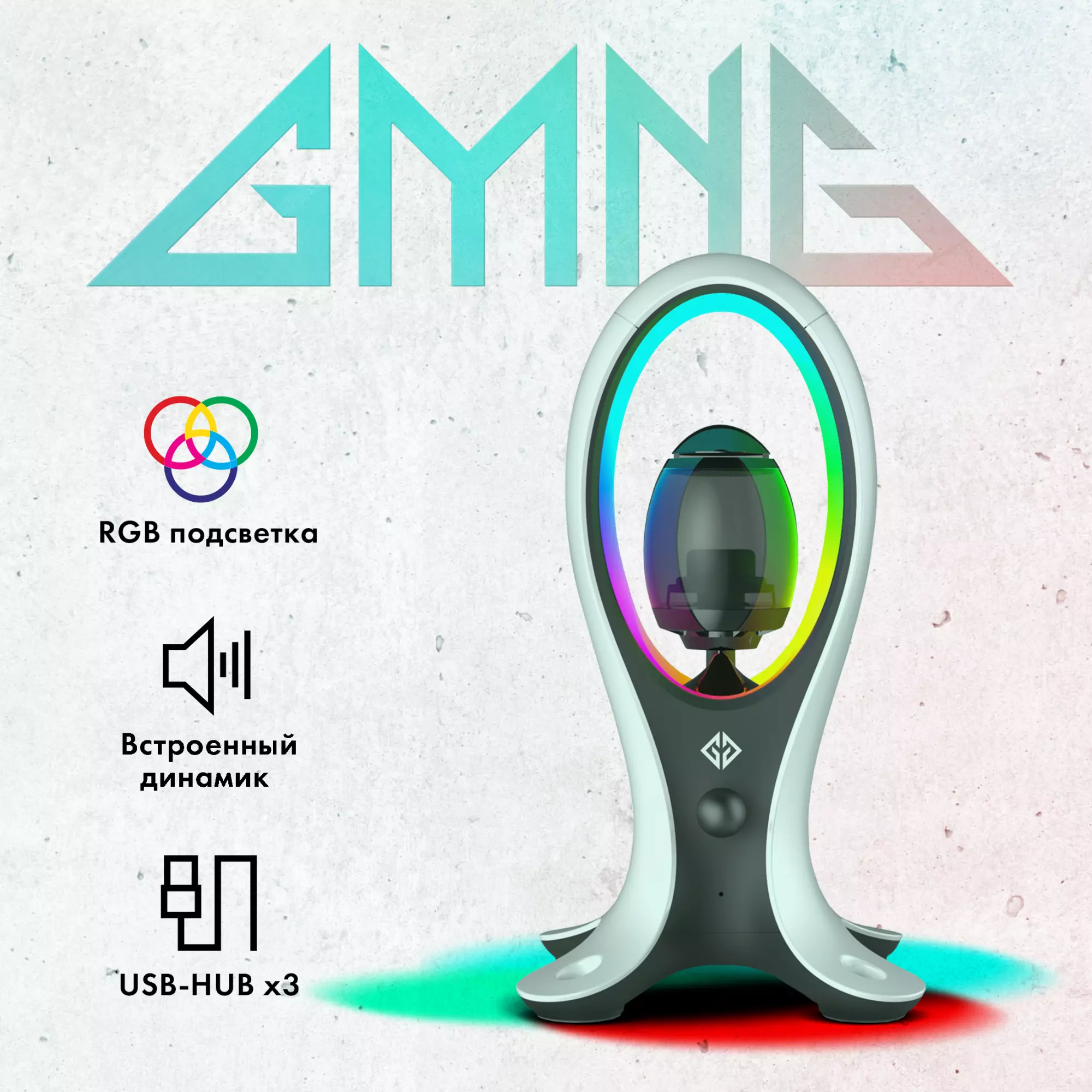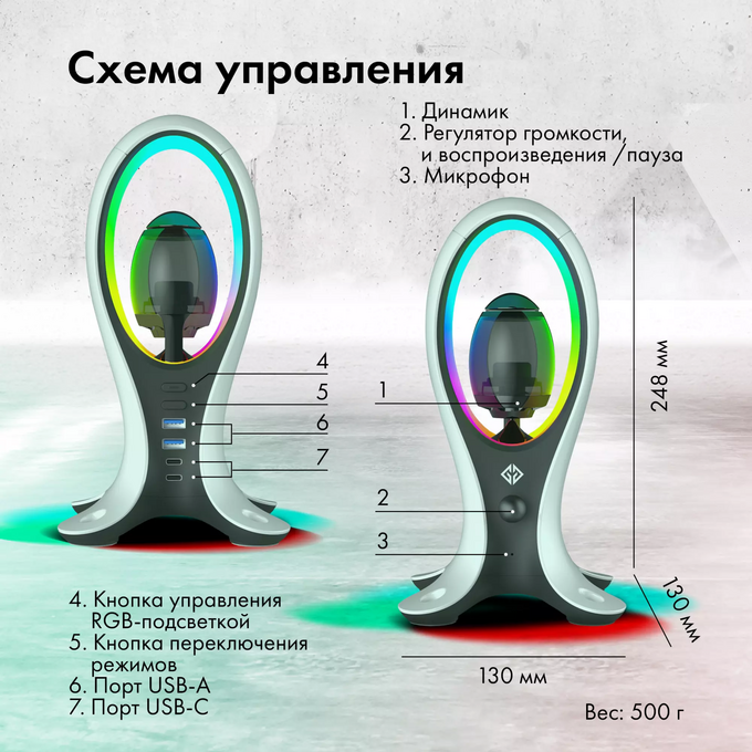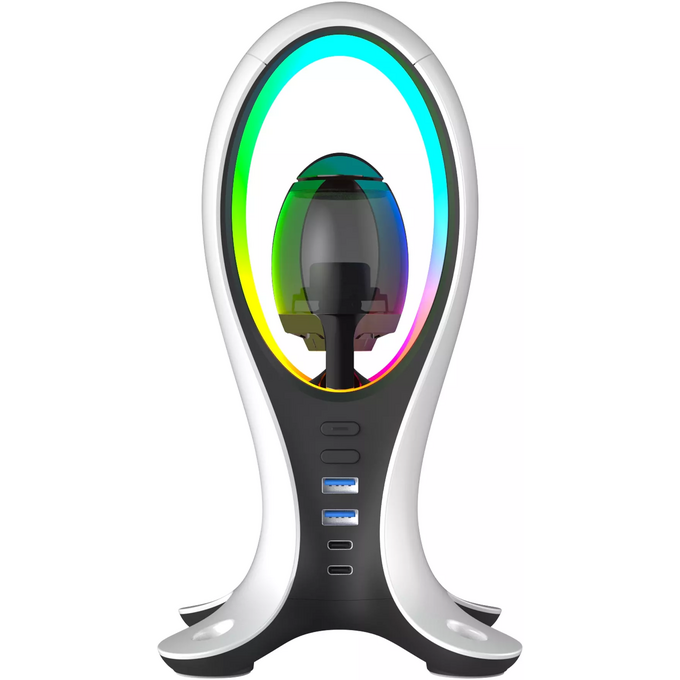 Подставка для гарнитуры с динамической RGB подсветкой, встроенным динамиком для воспроизведения аудио, с поддержкой режима HUB'а. Поддержка BlueTooth.