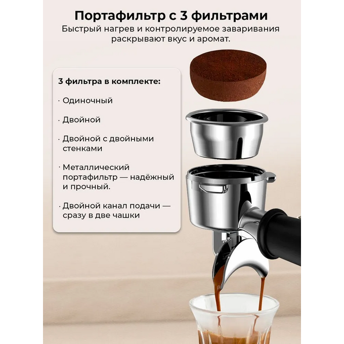Особенности кофеварок/кофемашин: Подача горячей воды, Съемный многоразовый фильтр, Режим самоочистки, Автоматический выбор рецепта, Функция памяти объема напитка
