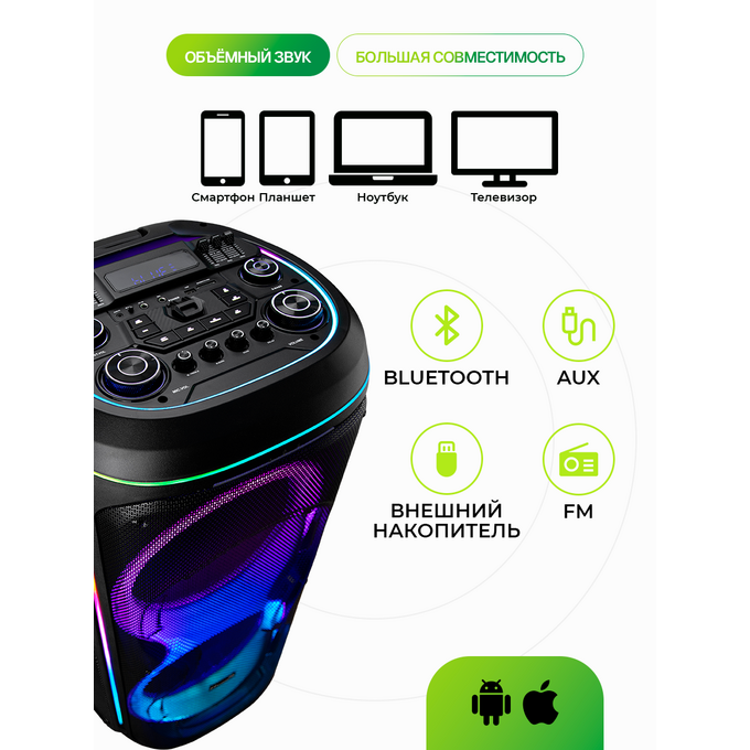 FM-радио, дисплей, караоке, поддержка microSD, ручка, световые эффекты