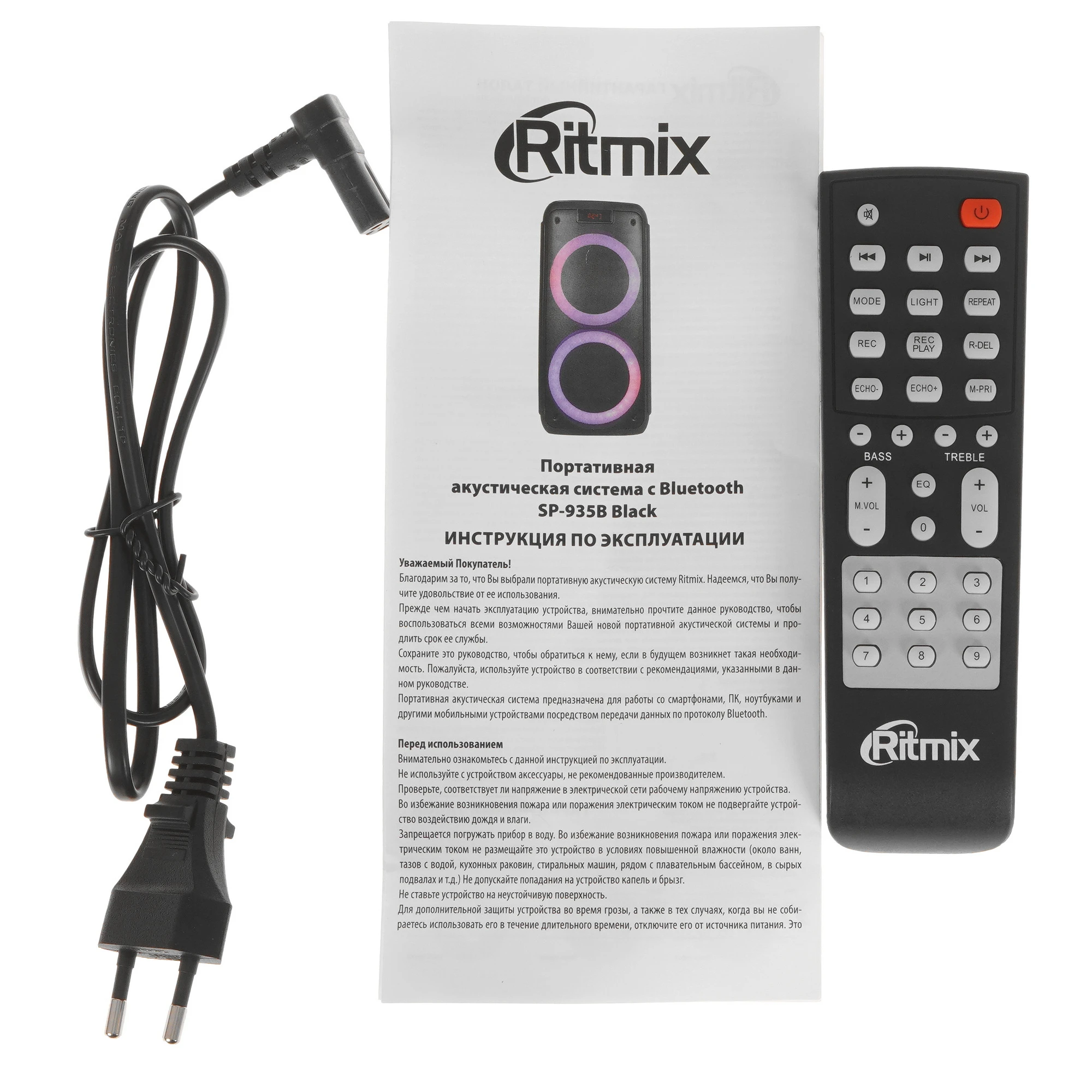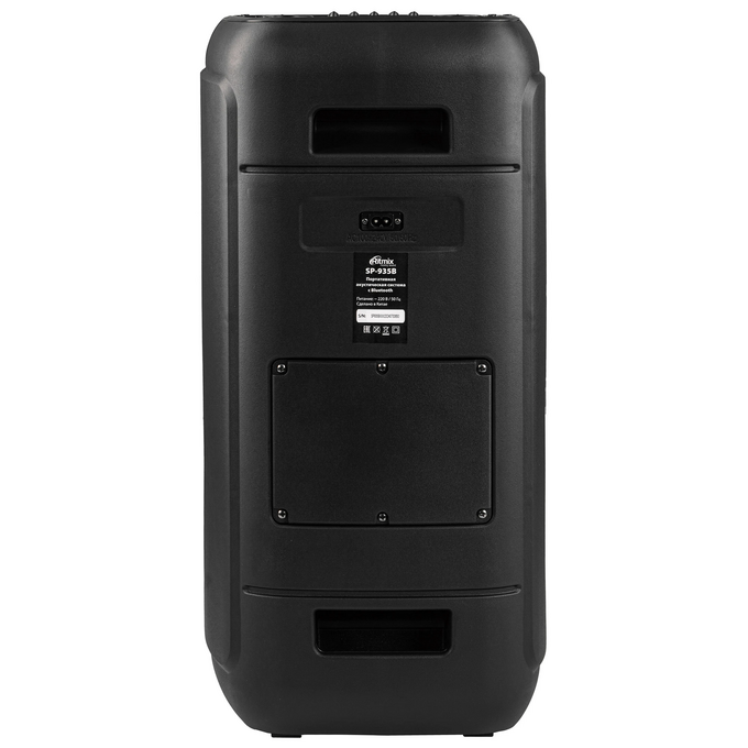 Ritmix SP-935B - портативная Bluetooth-колонка, имеющая AUX-вход, два 6.3 мм входа для микрофона и встроенный FM-радиоприемник, а также способная воспроизводить музыку с карточки microSD или USB-флешки.
