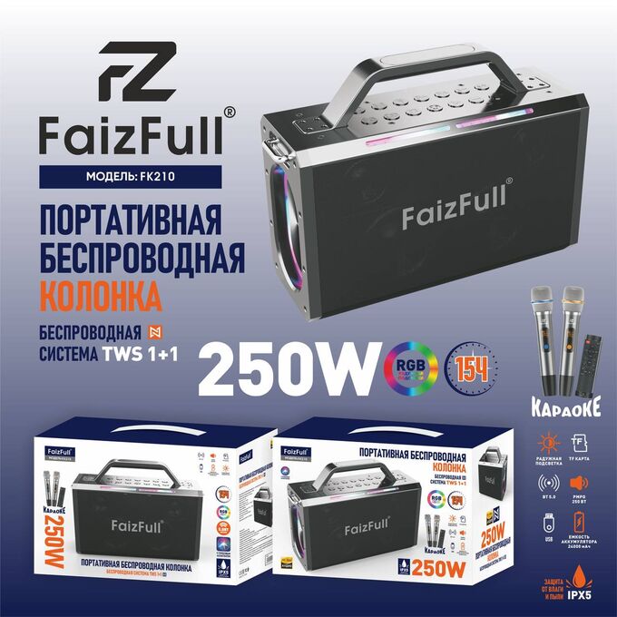 Портативная колонка FaizFull FK210 Караоке 250W RGB IPX5 TWS