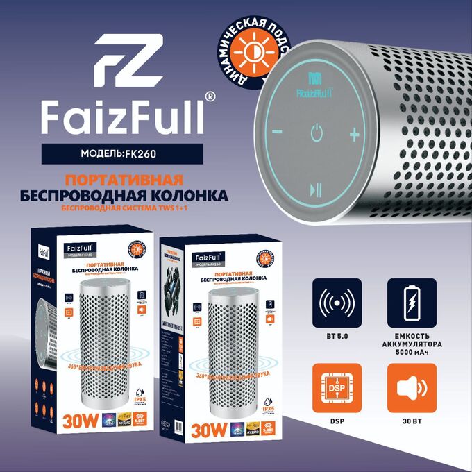 Портативная колонка FaizFull FK260 Серебристый 30W IPX5 BT5.3 TWS (Корпус Алюминиевый)