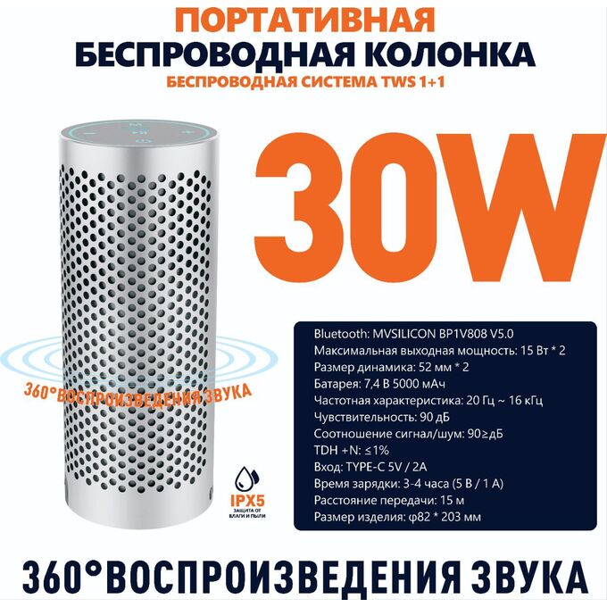 портативная колонка с мощностью 30 Вт и емкостью аккумулятора 5000 мАч, водонепроницаемый корпус с защитой IPX5, подключение через Bluetooth 5.0, сенсорные кнопки управления, поддержка технологии TWS для создания стереозвука