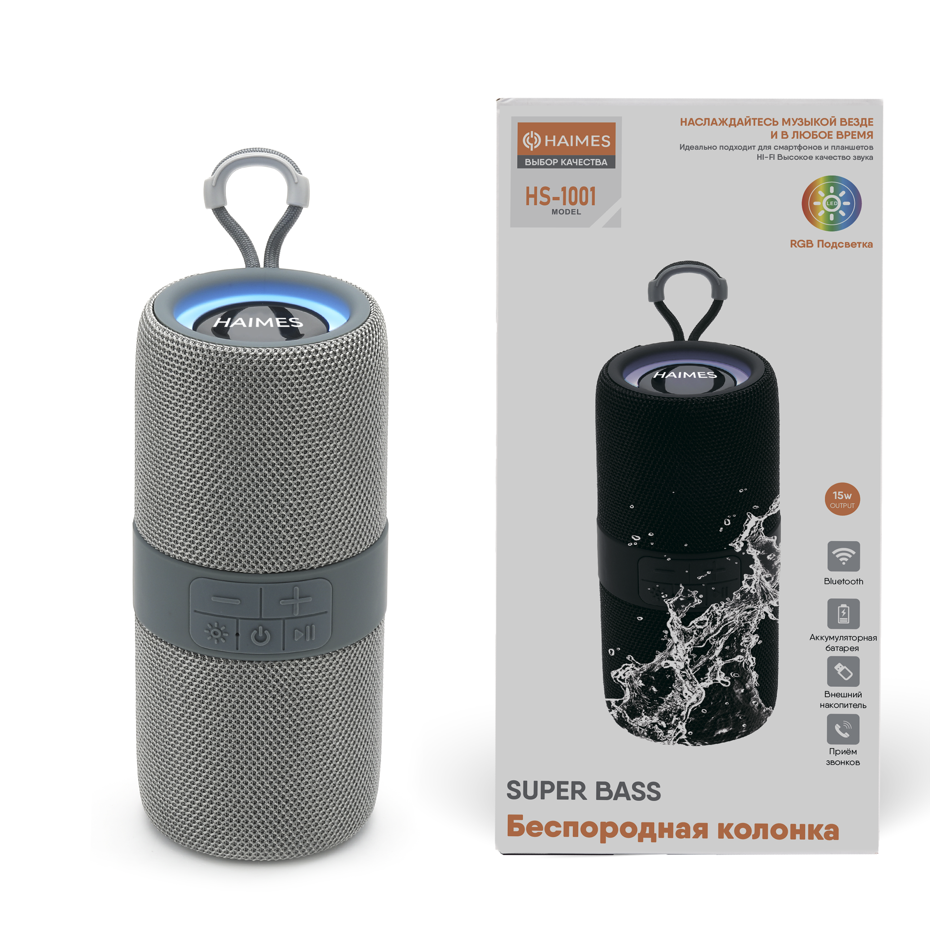 Портативная колонка TWS, 15Вт, АКБ 1200мAh, RGB-подсветка, HAIMES HS-1001