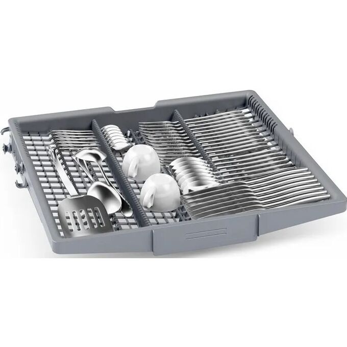 Внутренняя ванна из нержавеющей стали сочетает долговечность и гигиеничность, а продуманная конструкция трёх корзин гарантирует глубокую гибкость при расстановке посуды: верхняя полка оснащена двумя полочками для чашек, а система Rackmatic-3 позволяет менять высоту, подстраивая пространство под крупные предметы. В нижней корзине предусмотрены четыре складных направляющих для тарелок, в верхней — две складные планки, что упрощает размещение нестандартных форм и объёмных приборов.