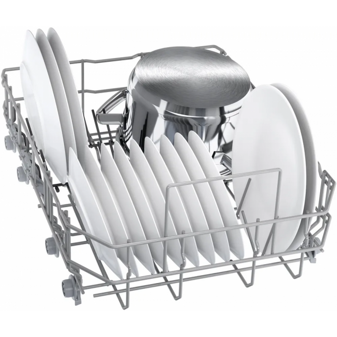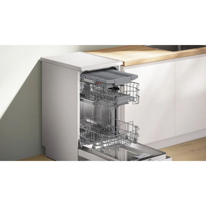 Представьте посудомоечную машину BOSCH SPS4HMI64Q из серии 4 – отдельностоящий вариант шириной 45 см в стильном серебристом цвете, идеально подходящий для компактных пространств. Эта модель сочетает передовые функции с простотой использования, обеспечивая безупречную чистоту посуды благодаря интуитивным программам и интеллектуальным опциям. Система Vario Flex корзин позволяет настраивать пространство для любой нагрузки, от тарелок до кастрюль, а третий короб специально для столовых приборов оптимизирует хранение с двумя складными держателями в нижней корзине. Для удобства опция Rackmatic 3 регулирует высоту верхней корзины, а один подстаканник в верхней для надежной фиксации бокалов.