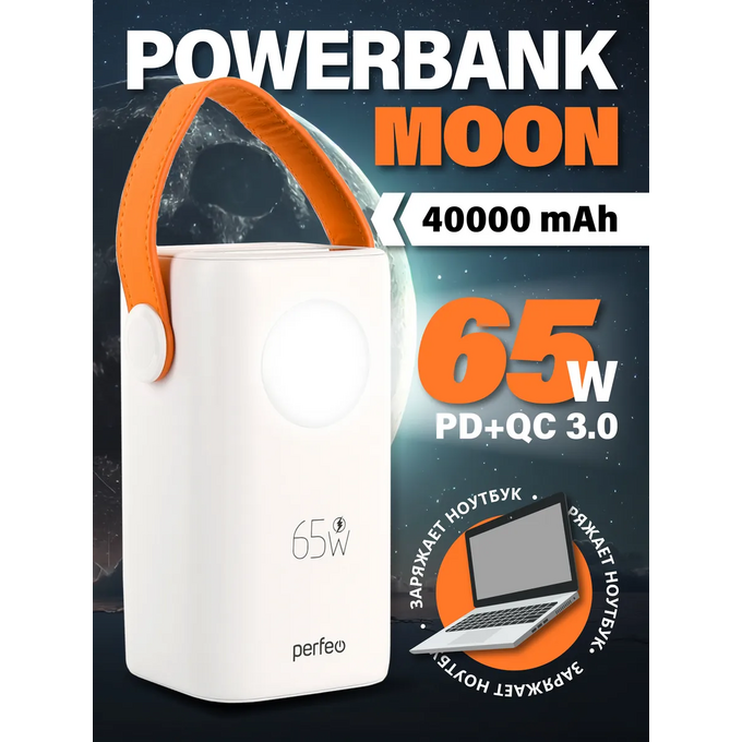 Модель Perfeo Powerbank MOON 65W 40000 mAh/LED дисплей/PD+QC 3.0/2Type-C/2 USB/Выход:5A,max 65W
