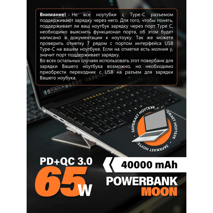 Внимание! Не все ноутбуки поддреживают зарядку через Type-C. Более подробно описали на слайде, см фото. Внешний аккумулятор Moon 40000 mAh – это незаменимый гаджет для тех кто часто находится в пути и нуждается в дополнительной зарядке своих устройств. Ёмкость в 40000 мА*ч, повербанк обеспечивает достаточно мощности для нескольких циклов зарядки телефона, планшета, может зарядить ноутбук. Одним из главных преимуществ этого аксессуара является наличие нескольких видов разъемов (USB-A, Type-C), что позволяет подключать различные устройства одновременно и заряжать их быстро и эффективно. Материал корпуса выполнен из высококачественного поликарбоната, что делает его одновременно легким и прочным. Встроенная защита от перегрева, перезаряда и короткого замыкания гарантирует безопасность использования. Дополнительная опция портативного зарядного устройства включает возможность зарядки малым током, которая подходит для беспроводных наушников, смарт часов и фитнес браслетов. Функция сквозной зарядки позволяет одновременно заряжать до трех устройств, а возможность быстрой подзарядки делает его идеальным выбором для тех, кто ценит свое время и всегда хочет быть на связи. Повербанк поддерживает протоколы быстрой зарядки QC 3.0 и PD. Максимальный выходной ток 3.25А обеспечивает очень быструю зарядку ваших устройств. Благодаря своей универсальности и наличию различных гнезд, переносной аккумулятор может быть использован для зарядки любой электроники, включая модели iPhone и Android. Универсальный и стильный внешний аккумулятор Moon станет незаменимым помощником для всех, кто ценит удобство, функциональность и возможность всегда оставаться на связи. . Характеристики по выходным напряжениям и токам указана на отдельном слайде.
