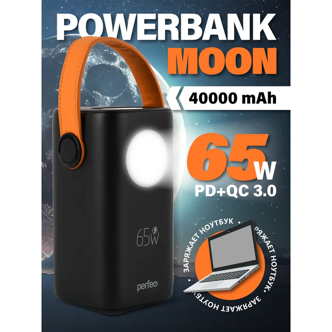 Модель Perfeo Powerbank MOON 65W 40000 mAh/LED дисплей/PD+QC 3.0/2Type-C/2 USB/Выход:5A,max 65W