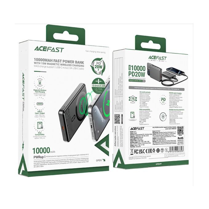 Power Bank ACEFAST M12 PD20W Ultra-thin Magnetic Wireless Charging Power Bank 10000mAh Black
