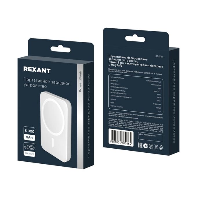 Power Bank REXANT 30-2053 5000 mAh, MagSafe, белое