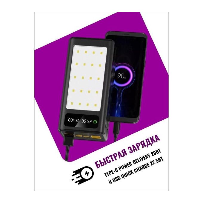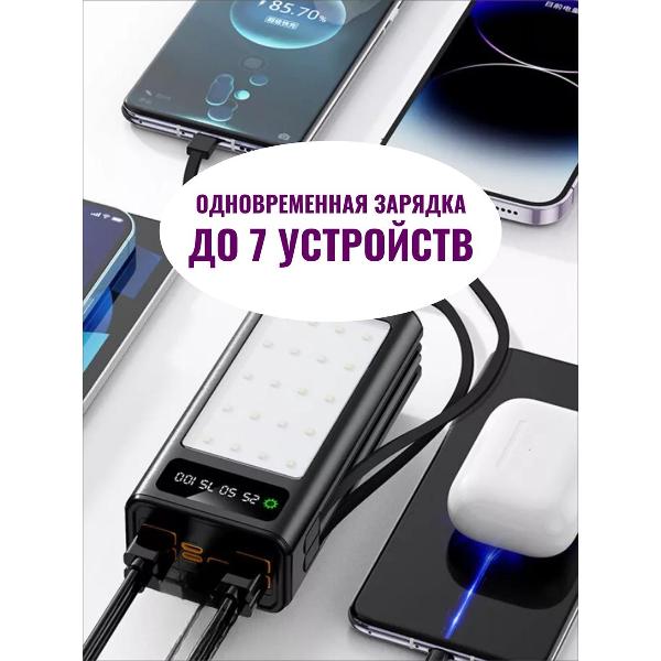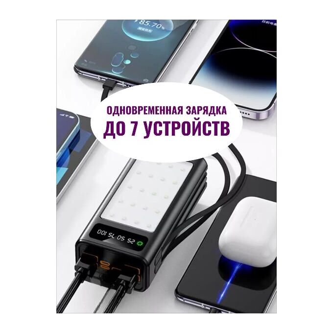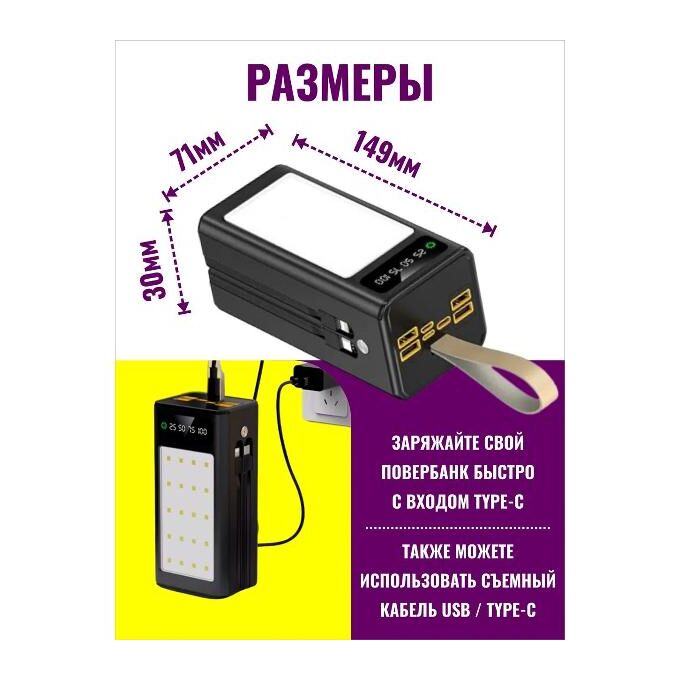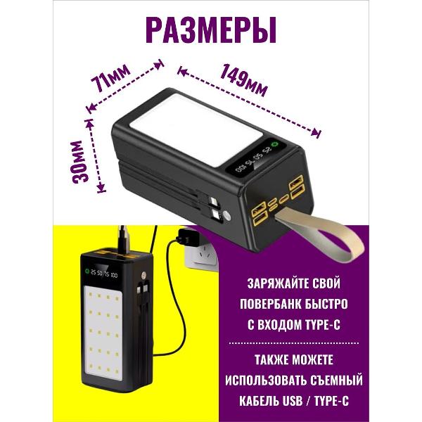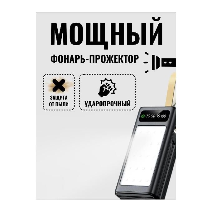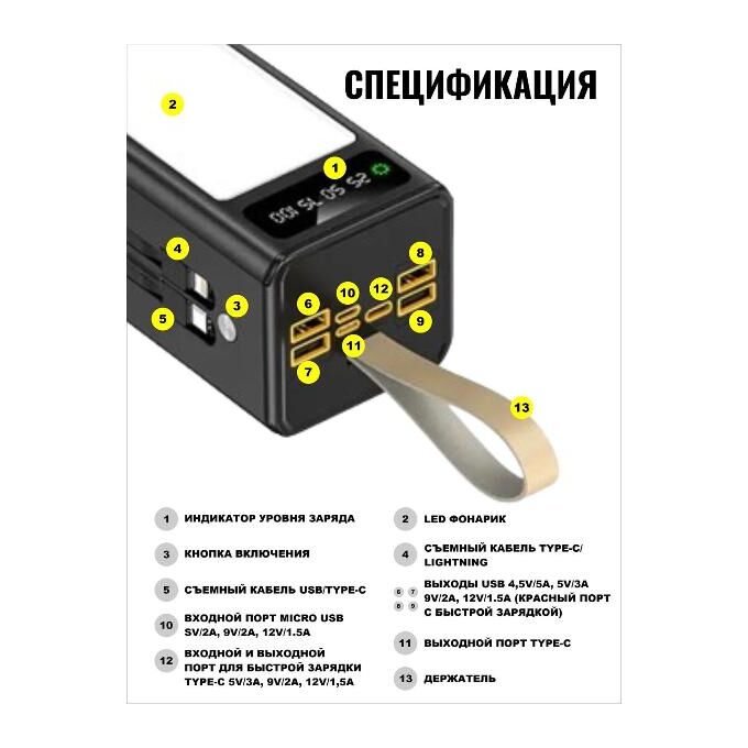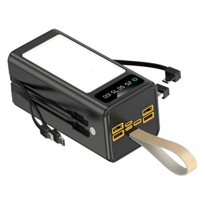 Ручка для переноса. Встроенный большой LED-фонарь. Большое количество портов и встроенных кабелей. Информационный дисплей.