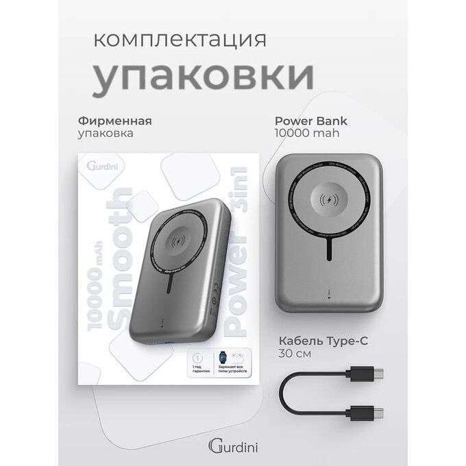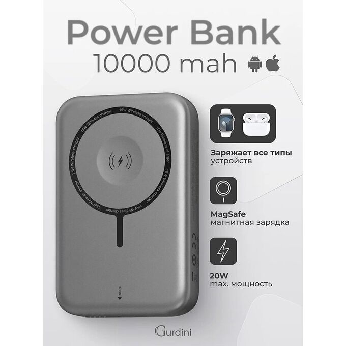 Powerbank Gurdini Smooth Series GPWS-01B Wireless Magnetic Charge Apple Watch Charging 20W Gray