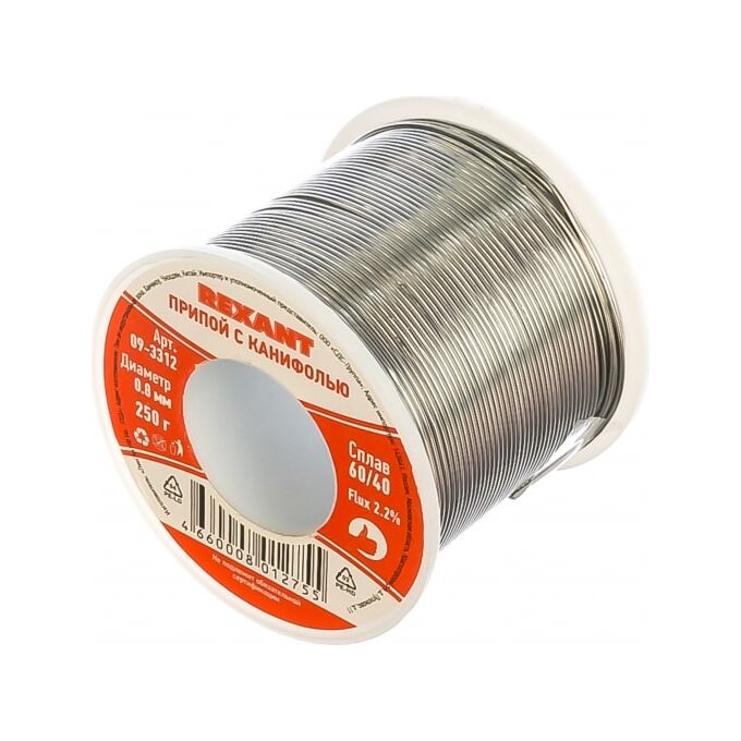 Припой с канифолью REXANT 09-3312 250г, 0.8мм, Олово 60%, Свинец 40%, Катушка