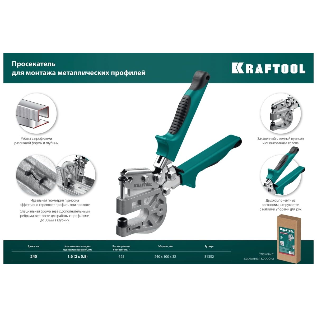 Просекатель для монтажа металлических профилей KRAFTOOL Kayman31352 надежный инструмент, обладающий сильной пробивной способностью. Соединяет между собой металлические профили в любом положении и под любым углом. Максимальная толщина сшиваемых профилей: 1,6 (2 х 0,8) мм. Предназначен для быстрого крепления металлических профилей без использования заклёпок. Инструмент позволяет добиться прочного обжимного соединения.