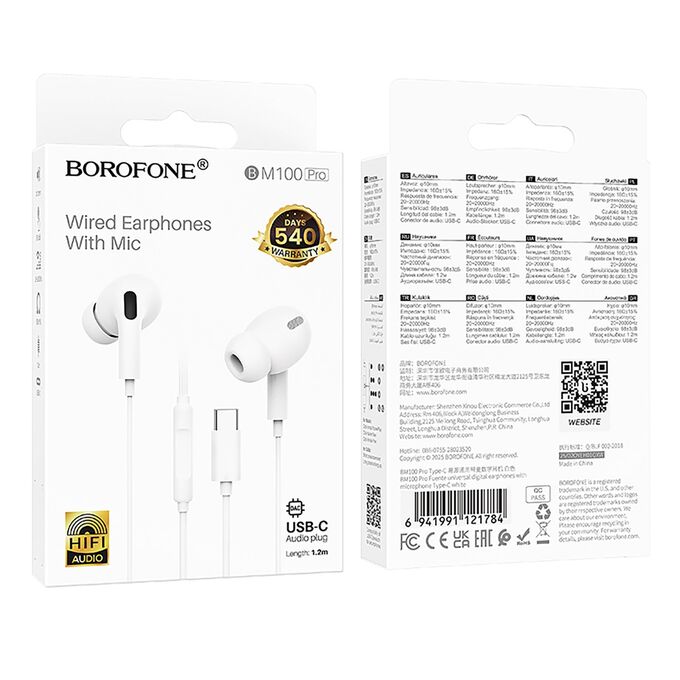 Проводные наушники внутриканальные Borofone BM100 Pro Type-C (white) (241886)
