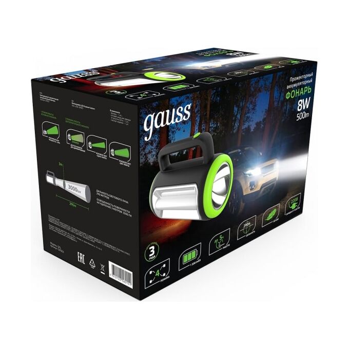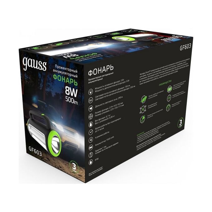 Дальность луча от самого мощного фонаря составляет 500 метров. Все модели прожекторных фонарей обладают современным дизайном корпуса и покрытием «Soft touch» - без эффекта скольжения в руках и приятным тактильным ощущением. Прожекторный фонарь Gauss модель GFL603 8W 400lm lead acid 1500mAh диммируемый LED 1/10/20 GF603 хорошо подойдет для использования на даче, для альпинизма, поисково-спасательных работ, а также для кемпинга или активного отдыха за городом. Оснащен Li-ion аккумулятором с большой емкостью, чтобы обеспечить непрерывную работу даже в самых критичных моментах.