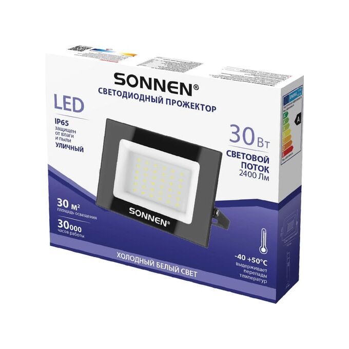 Прожектор светодиодный SONNEN 238413 30Вт, 6500К, 2400Лм, 30м2, IP65, 146x98x26мм, черный