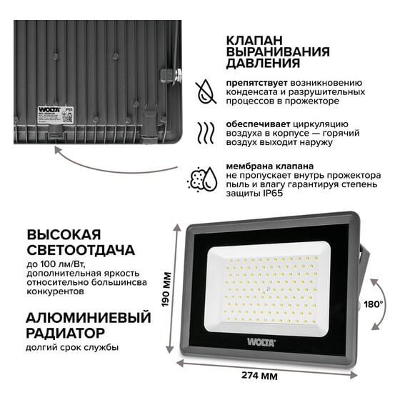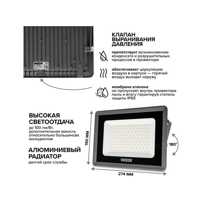 Прожектор светодиодный WOLTA WFL-100W/06 100Вт 5700К IP65