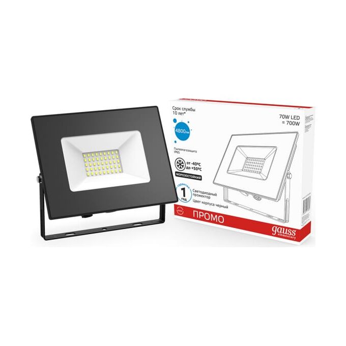 Светодиодный прожектор Gauss Elementary 70W 4370lm IP65 6500К черный ПРОМО 613100370P созданный для экстерьерной общей подсветки зданий и сооружений, освещения складов, промышленных и торговых объектов, а также ландшафтных объектов, теперь имеет улучшенную модификацию корпуса.