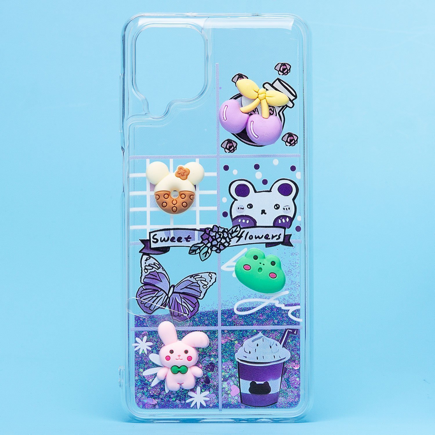Прозрачный силиконовый чехол SC331 с объемными стикерами для Samsung Galaxy A12/ Накладка с защитой камеры, с блёстками/ фиолетовый