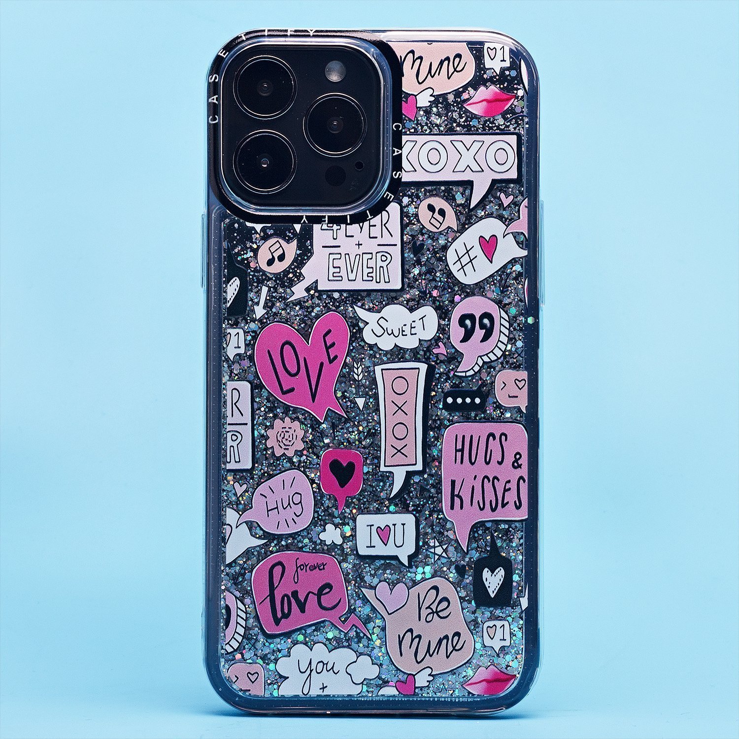 Прозрачный, силиконовый чехол с забавными рисунками и переливающимися внутри блёстками.