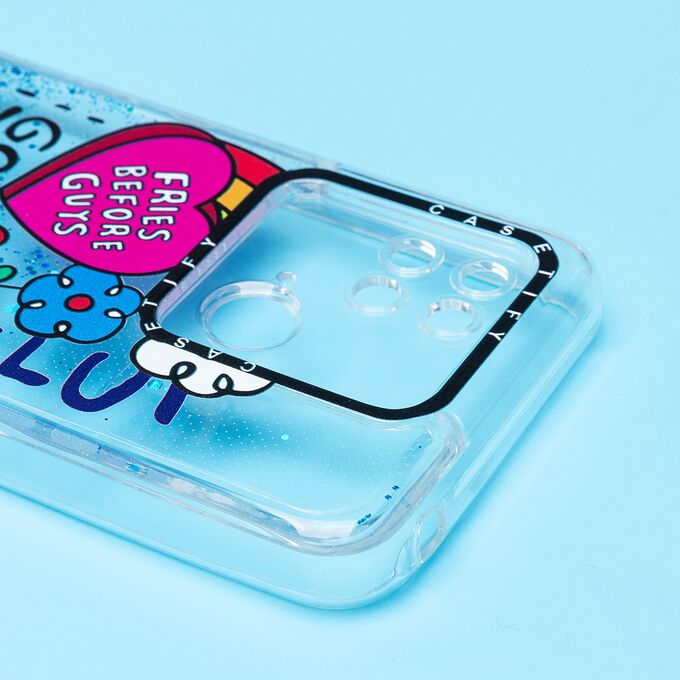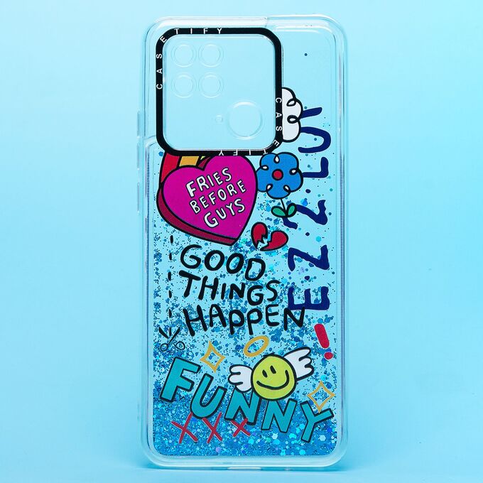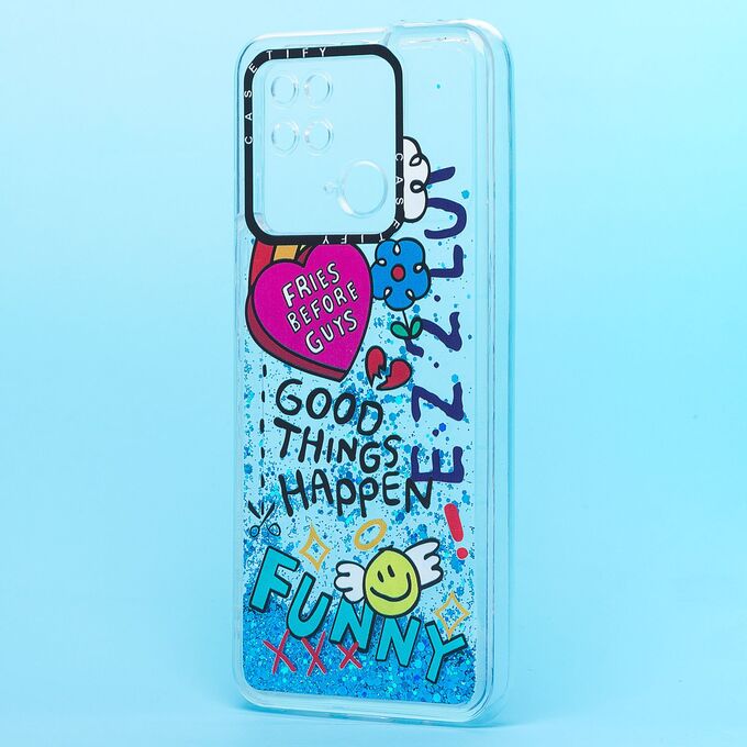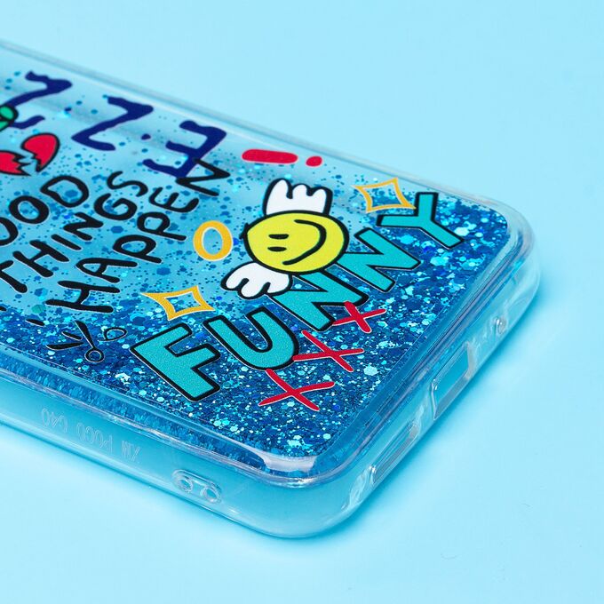Прозрачный, силиконовый чехол с забавными рисунками и переливающимися внутри блёстками.