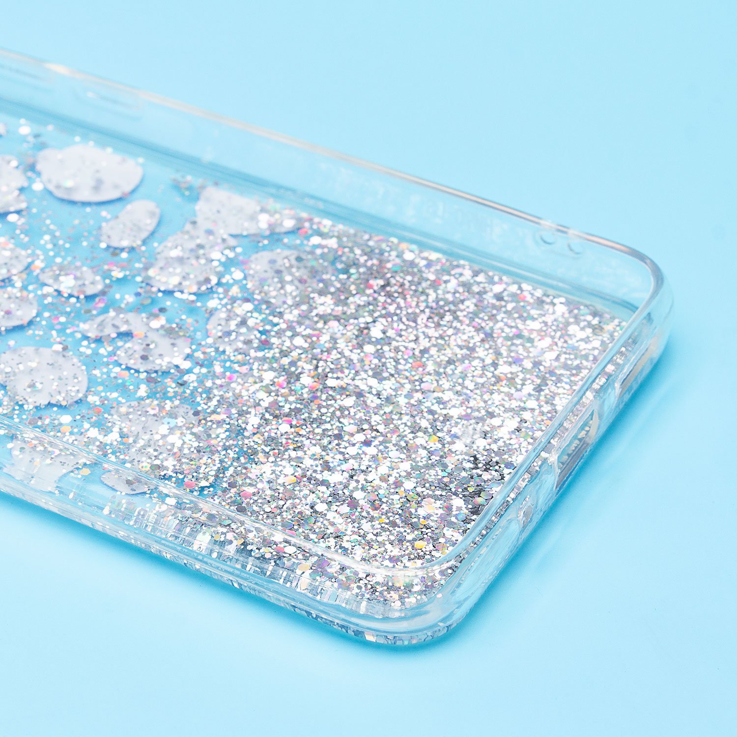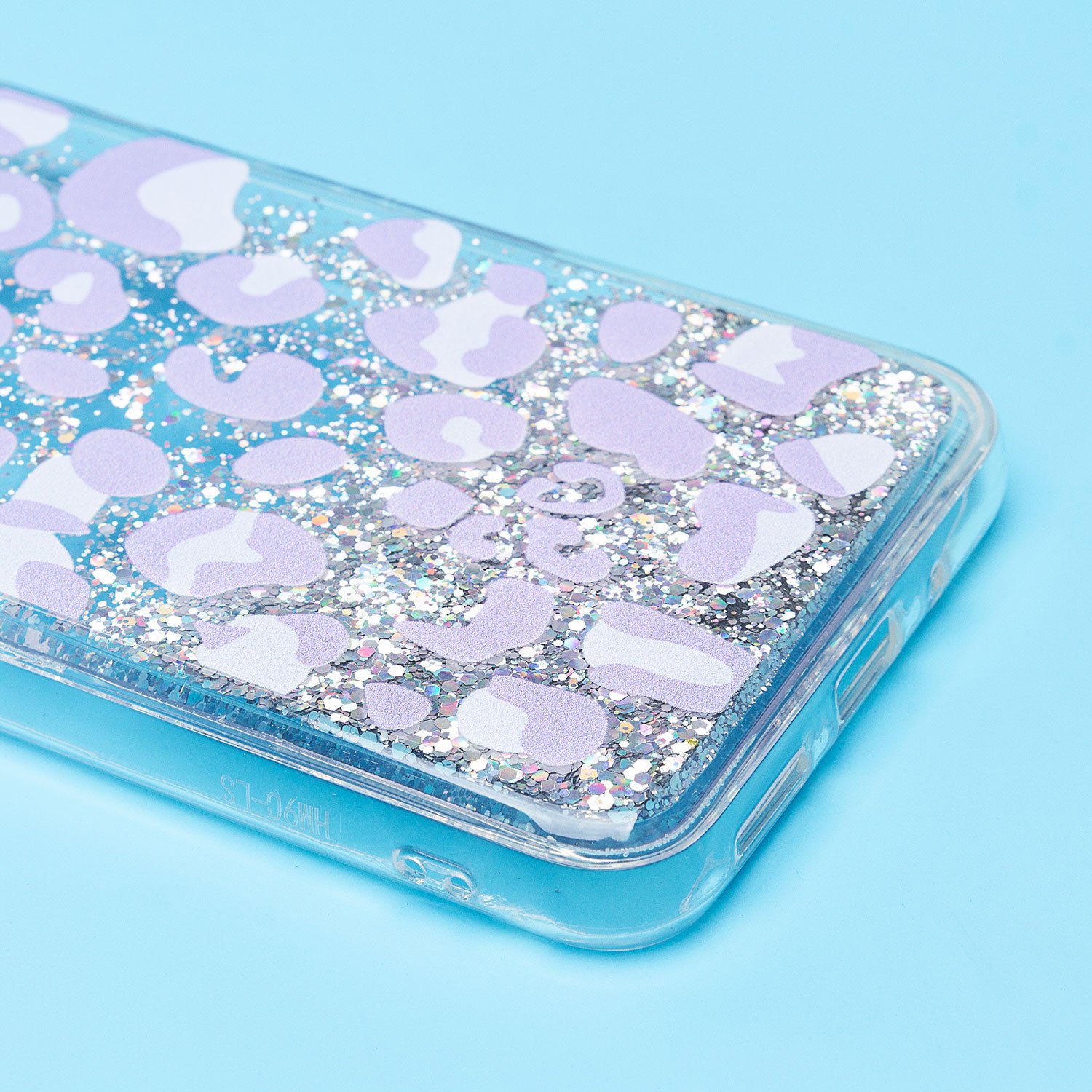 Прозрачный, силиконовый чехол с забавными рисунками и переливающимися внутри блёстками.