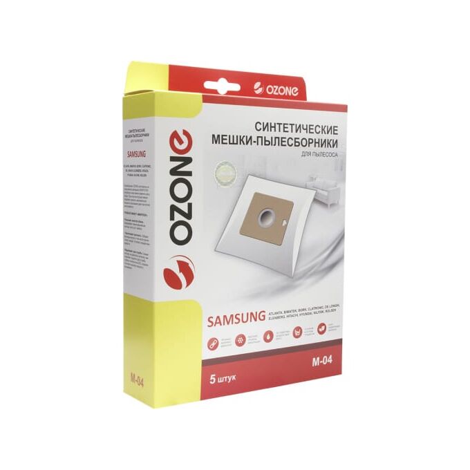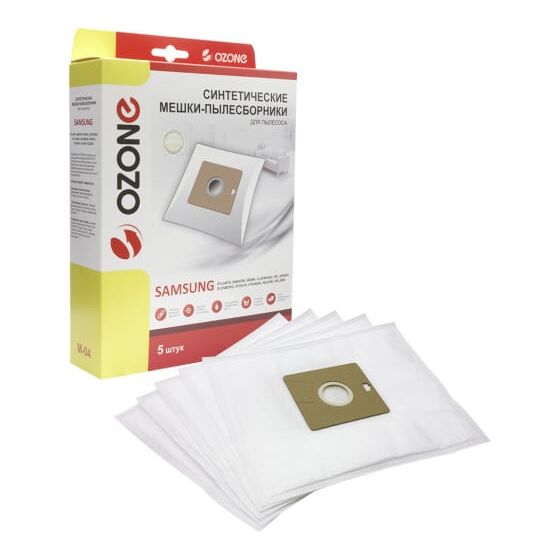 Мешки-пылесборники оригинальные синтетические OZONE (5 шт.) Samsung VP-95 M-04 являются одноразовыми и подходят к бытовым пылесосам. Сочетают в себе как высокую прочность, так и хорошие фильтрационные свойства. Способны удержать мелкие частицы пыли и микроорганизмов. Благодаря особому синтетическому материалу и новым технологиям, использованным в изготовлении пылесборников, могут выдержать до 30 кг нагрузки. Фланец 100х110 мм, отверстие в картоне 45 мм.