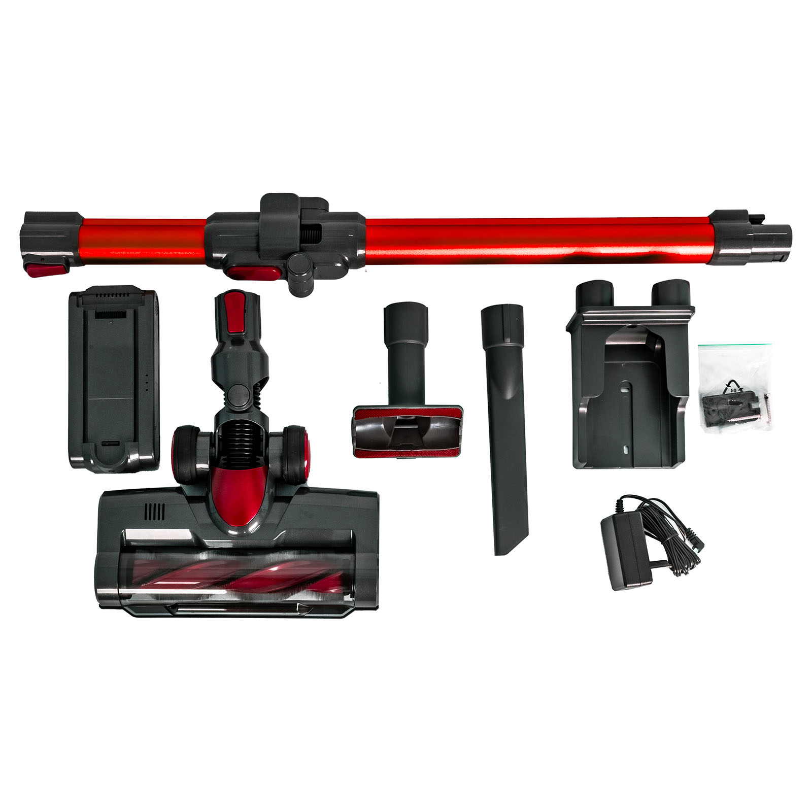 пылесос, адаптер питания, турбо-щетка c LED-подсветкой, узкая насадка для уборки труднодоступных мест и насадка-щетка, гарантийный талон, инструкция на русском языке