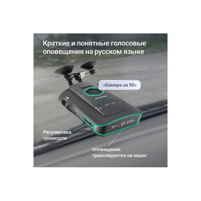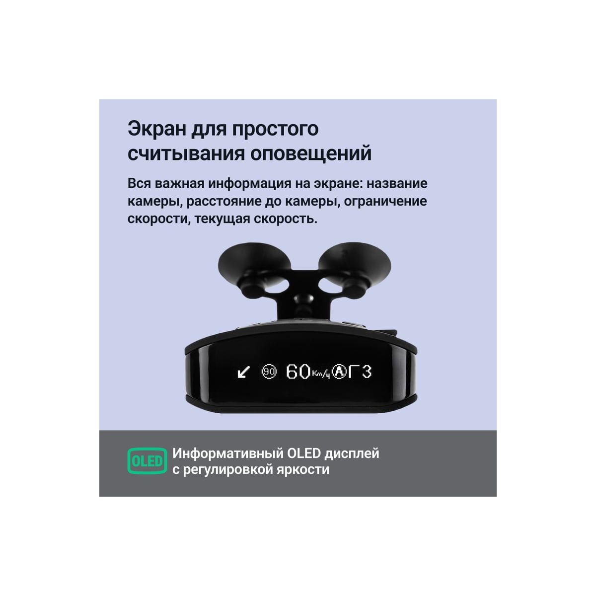 Голосовые оповещения на русском языке, всегда краткие и по делу, содержат исключительно важную информацию. Предусмотрен дисплей с трансляцией всех данных о типе камеры и виде контроля, расстоянии до нее, текущей скорости и ограничения.