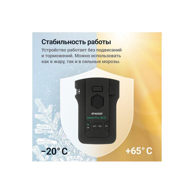 Автомобильный радар-детектор Roadgid Detect Pro Wi-Fi с защитой от ложных срабатываний и высокой дальностью обнаружения обеспечит надежную защиту от штрафов и комфорт при вождении. Модель оснащена не только радарным модулем, но и GPS-базой камер – благодаря двухфакторной детекции девайс точно распознает все типы камер и радаров.