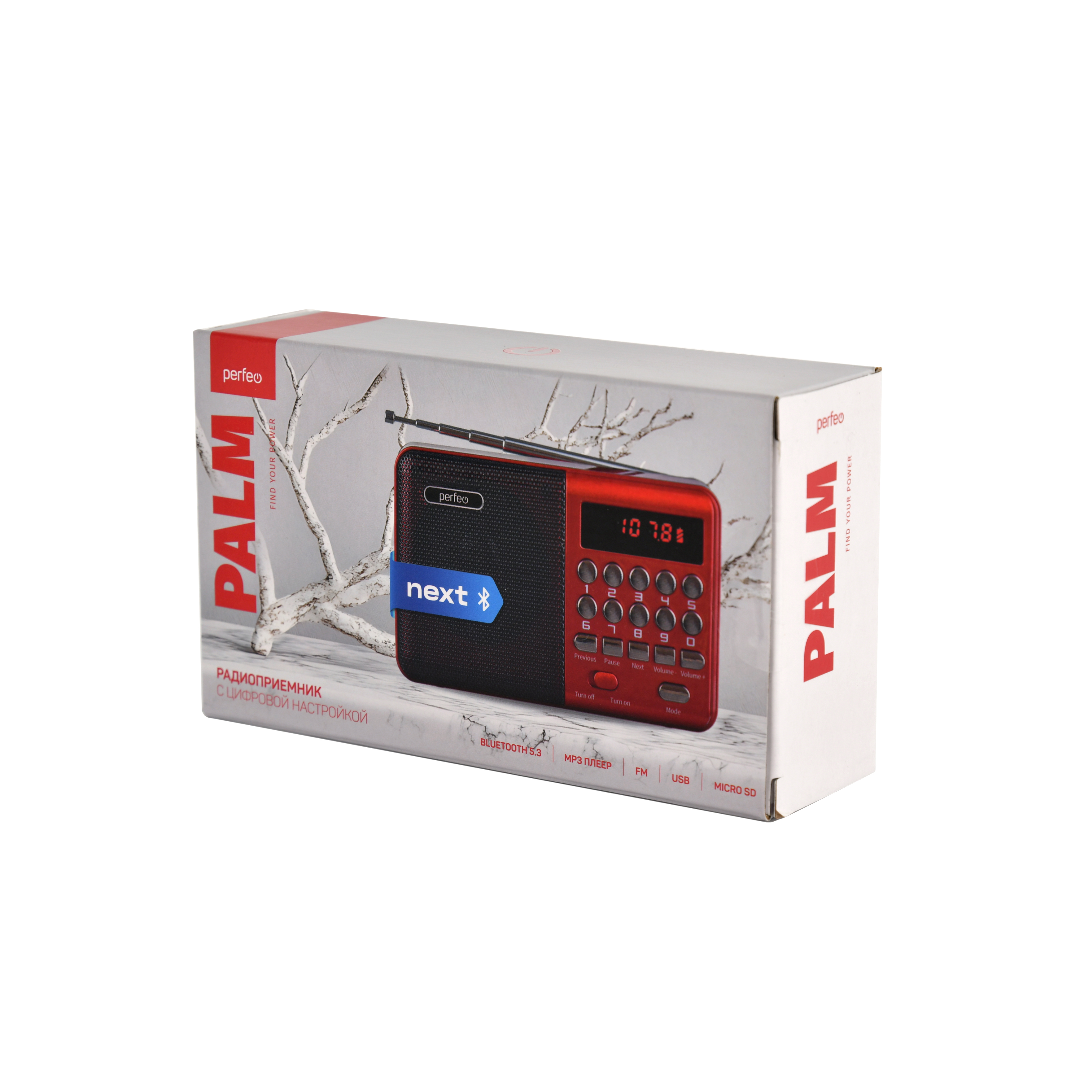 Радиоприемник цифровой Perfeo PALM FM+ 87.5-108МГц/ MP3 / USB / MicroSD Модуль беспроводной связи Bluetooth 5.3 для приёма аудиопотока.