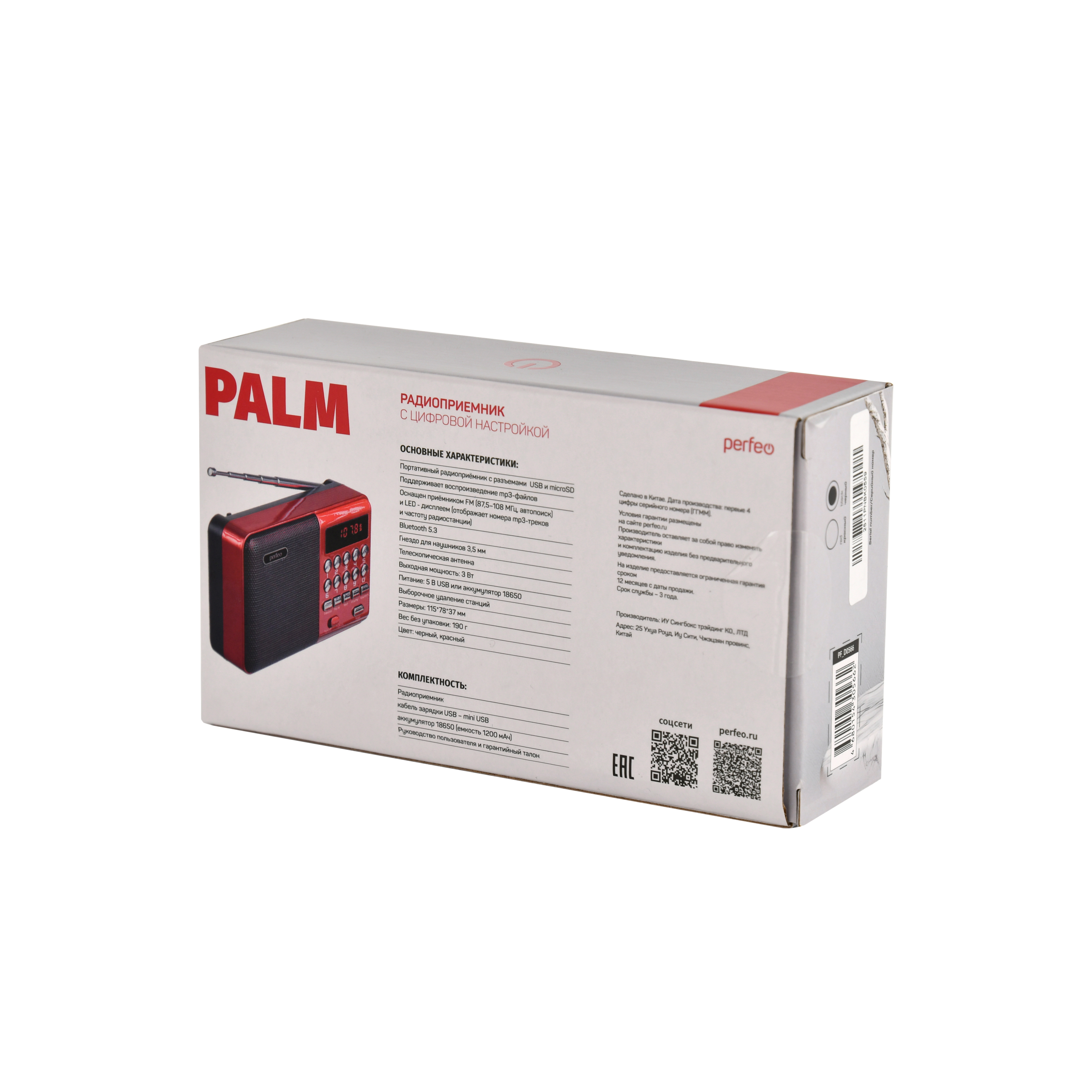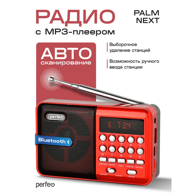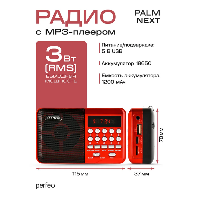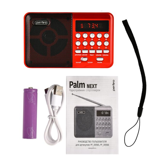 Радиоприемник цифровой Perfeo PALM (i90). Радио с расширенным функционалом умеет воспроизводит MP3-файлы с карт памяти и USB-флэшек. Приемник может работать не только от аккумуляторов (18650), но и от адаптера для зарядки (в комплект не входит) подключенного в сеть 220В. Радиоприемник от сети имеет встроенное цифровой тюнер FM (87,5 – 108 МГц) с автоматическим поиском станций. Радио оснащено поворотной телескопической антенной, возможность воспроизведения музыки с USB flash и microSD карт памяти, вход AUX для подключения источника звука. LED-дисплеем (отображает номера mp3-треков и частоту радиостанции). В комплекте идет кабель miniUSB для зарядки радиоприемника. Радиоприемник мини компактного размера удобно переносить, он помещается в карман. Это радио на аккумуляторе можно слушать даже ночью и не беспокоится, что можно кого-то разбудить, ведь у колонки с радио есть разъем для наушников. Радио PALM – отличный попутчик для поездок, путешествий и прогулок. Радиоприемник от сети и аккумулятора - легкий, удобный, компактный и многофункциональный, не займет много места и не оставит вас без любимой музыки. В нашем ассортименте магазина Perfeo есть множество портативных радиоприемников, они станут отличным подарком для родителей, дедушек и бабушек, подарят хорошее настроение и станут украшением вашего интерьера, прекрасно впишутся в любой дизайн, как дома, так и на даче, незаменимы в походе. Радиоприемник легко зарядить от повербанка, он не прихотлив в использовании.