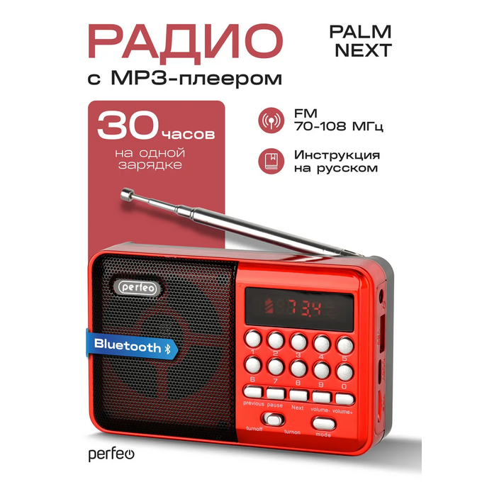 Радиоприемник Bluetooth цифровой Perfeo PALM Next/ FM 87.5-108МГц/ MP3/ Bluetooth 5.3/ USB или 18650/ Красный, (Арт. PF_D0565)