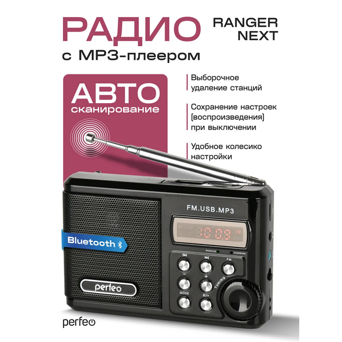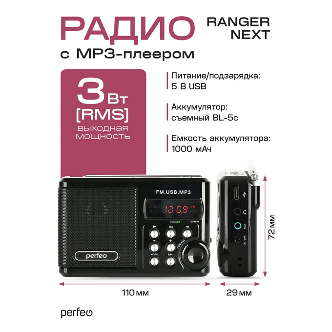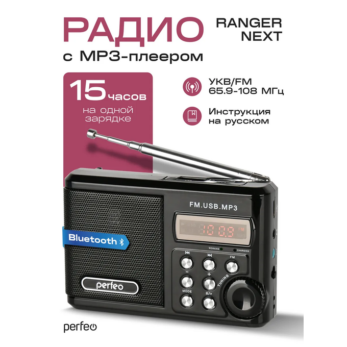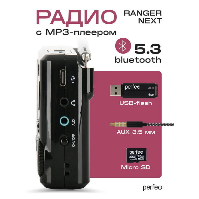 Радиоприемник Bluetooth цифровой Perfeo Sound Ranger Next/ УКВ+FM/ MP3/ Bluetooth 5.3/ 1000 mAh/ Черный, (Арт. PF_D0564)
