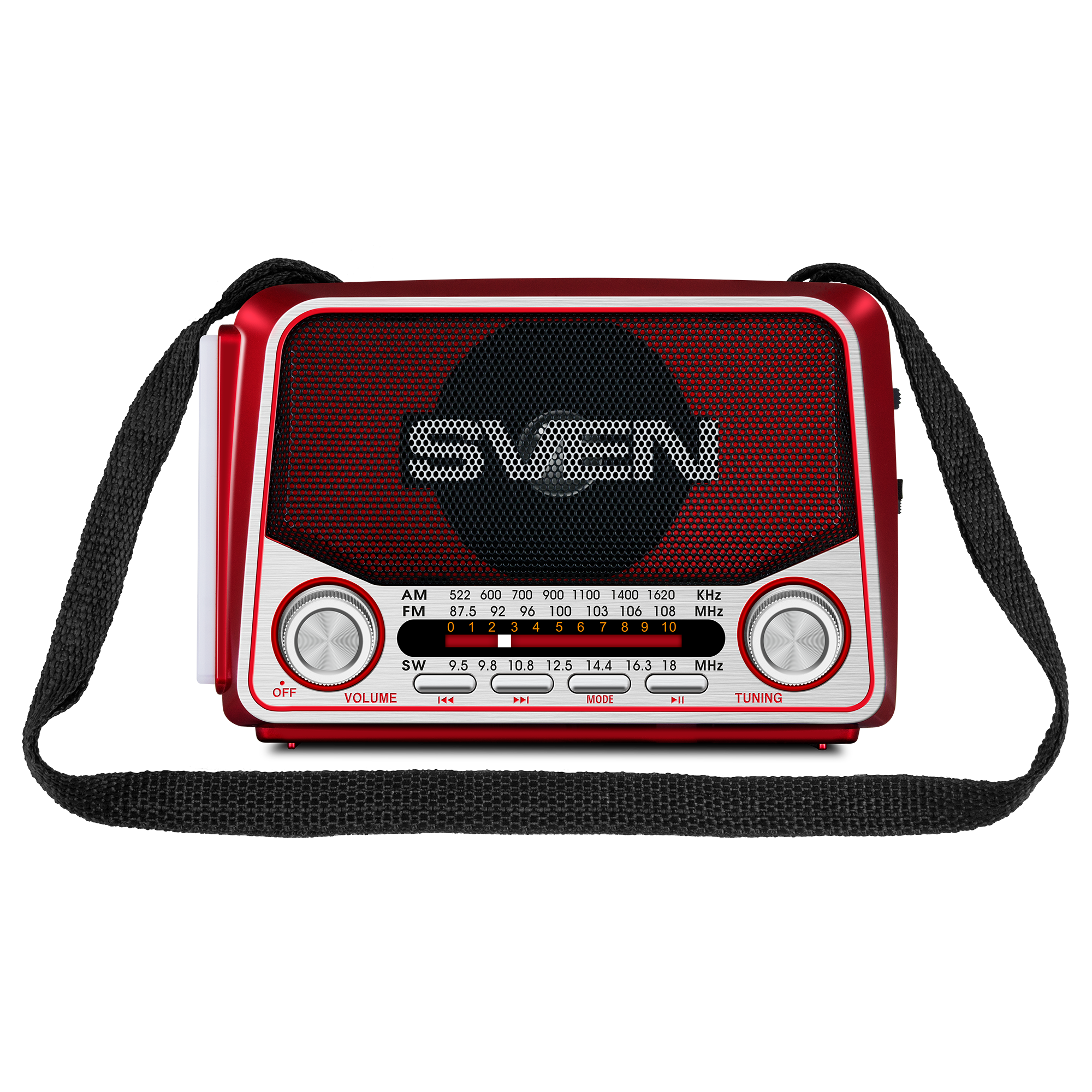 Радиоприемник SVEN SRP-150, красный (3 Вт, Bluetooth, FM/AM/SW, USB, microSD, фонарь, встроенный аккумулятор)