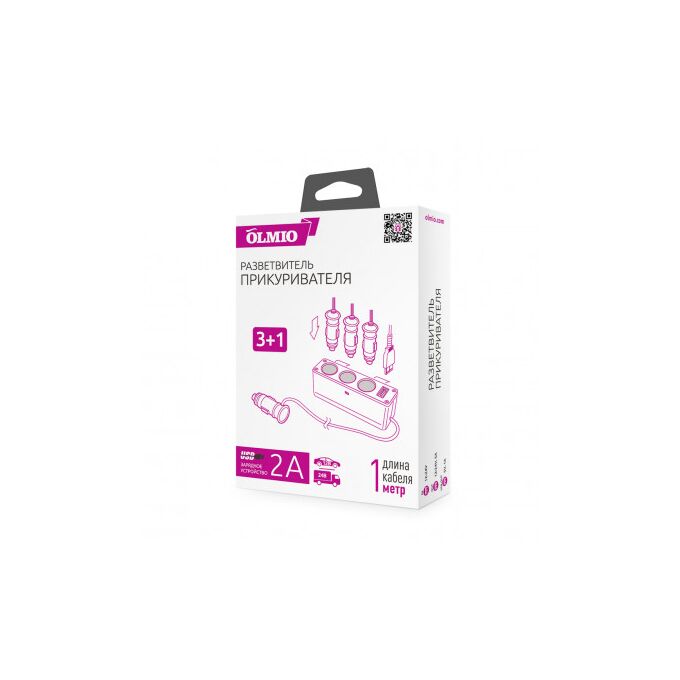 Разветвитель гнезда прикуривателя Olmio 3+1 с USB-портом, 2А, длина кабеля 1 метр