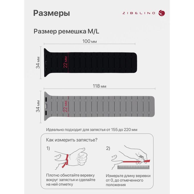 Ремешок размера M/L подходит для запястья обхватом от 15,5 до 22 см. Размер ремешка 218x22x2мм.