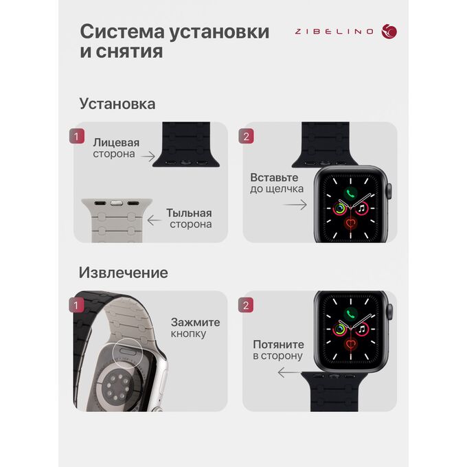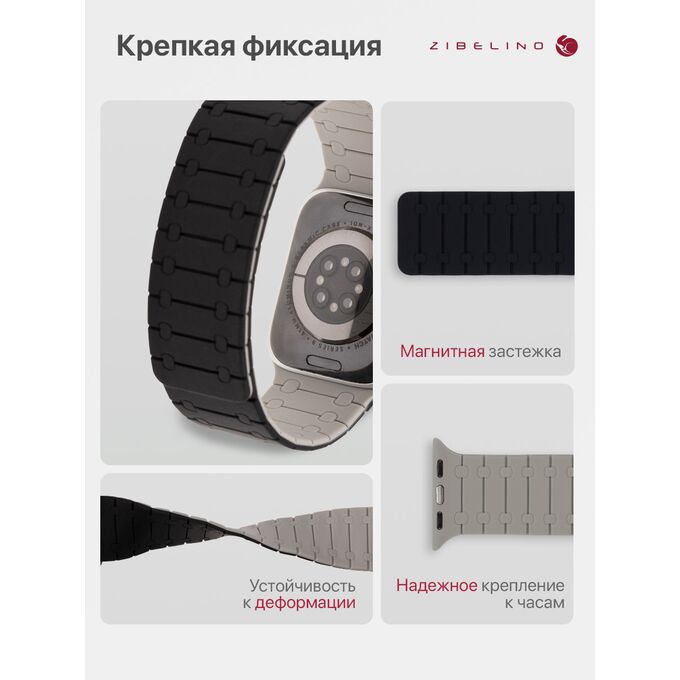 - Инновационное магнитное крепление мгновенно и надежно фиксирует ремешок на руке. Поднесите конец ремешка к основному полотну, и он зафиксируется с приятным щелчком. Это позволяет идеально подогнать ремень Эпл Вотч под любое запястье.