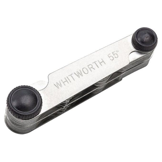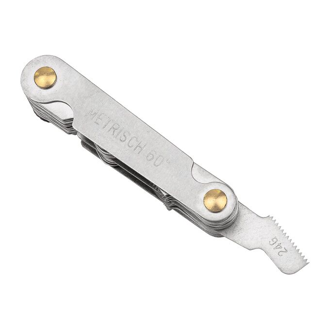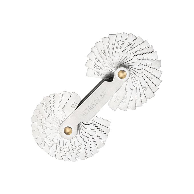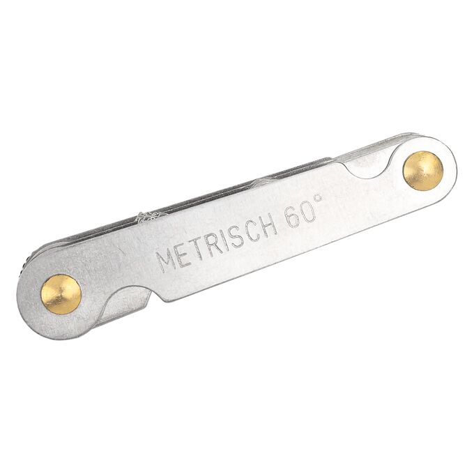 - Два стандарта в одном корпусе. Включает метрические шаблоны с углом 60° и дюймовые с углом 55° — охватывает широкий спектр резьб, от 0.25 мм до 6.0 мм и от 4G до 62G.