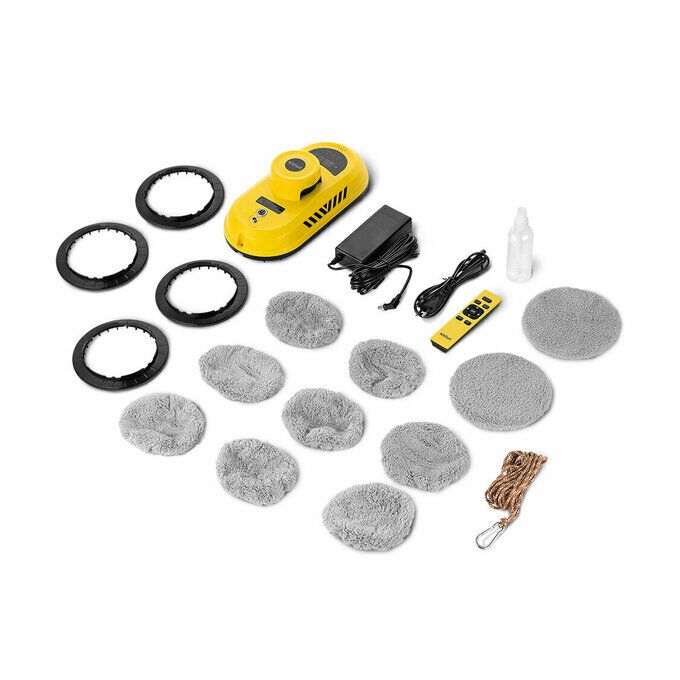 Робот для мойки окон, бутылка для воды с распылителем, пульт ДУ, батарейки ААА - 2 шт., держатель тряпки - 4 шт., блок питания, шнур питания, страховочный тросс с карабином, тряпка - 10 шт.