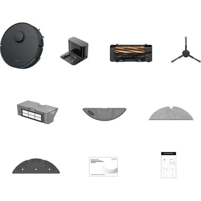 Робот-пылесос 1 Док-станция 1 Основная щетка и защита щетки 1 Боковая щетка 1 Салфетка для швабры 1 Пылесборник 1 Резервуар для воды 1 Мешок для пыли 1 Пластина расширения рампы базовой станции 1 Шнур питания 1 Руководство пользователя 1 Краткое руководство по эксплуатации 1