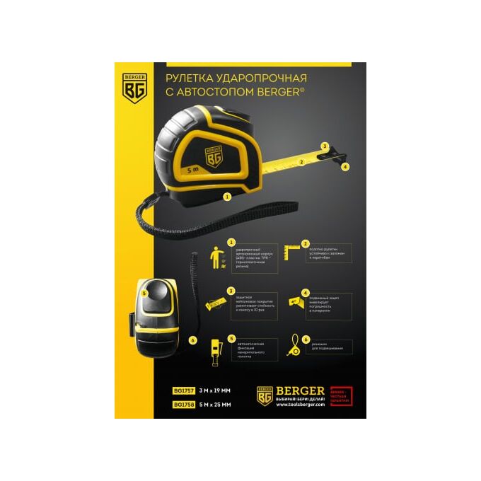 Рулетка BERGER BG1758 ударопрочная с автостопом 5м*25мм