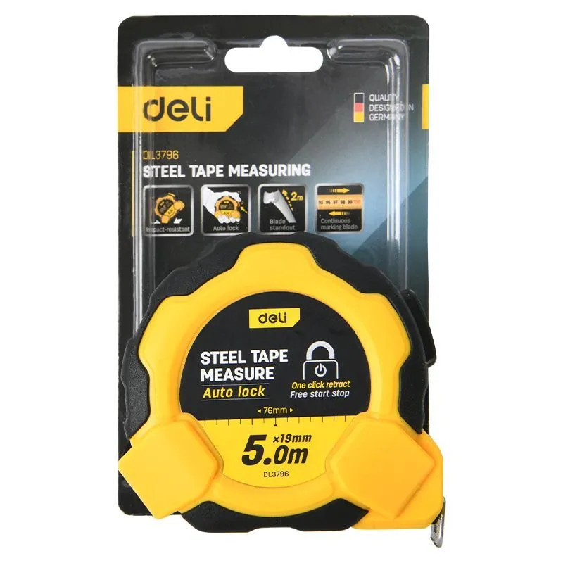 Рулетка Deli DL3796 5м*19мм, Автостоп, ударопрочный корпус, метрическая