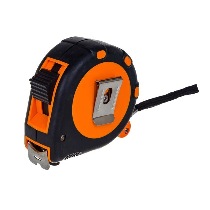 Корпус рулетки двухкомпонентный. Выполнен из ударопрочной пластмассы, частично обрезинен и имеет эргономичную форму.Рулетка имеет три независимых механизма фиксации ленты, что делает работу с рулеткой наиболее удобной.