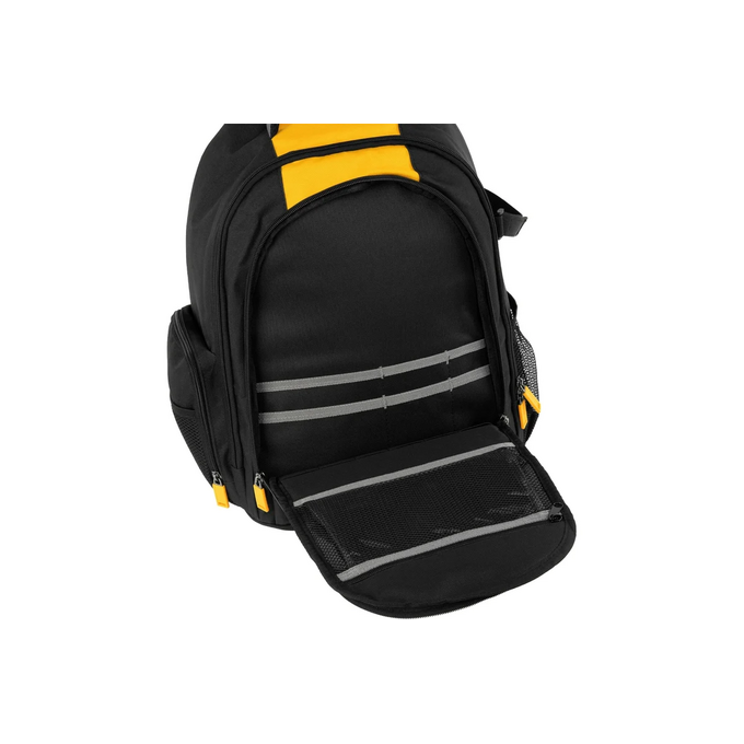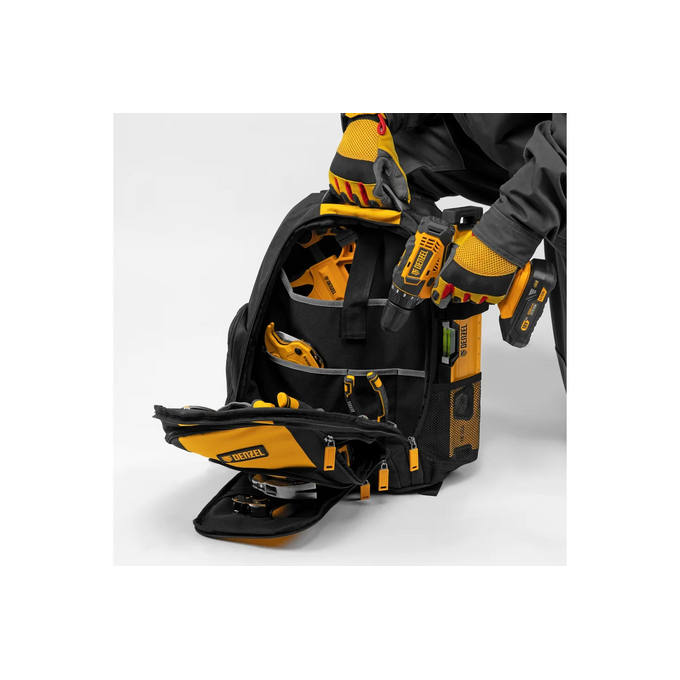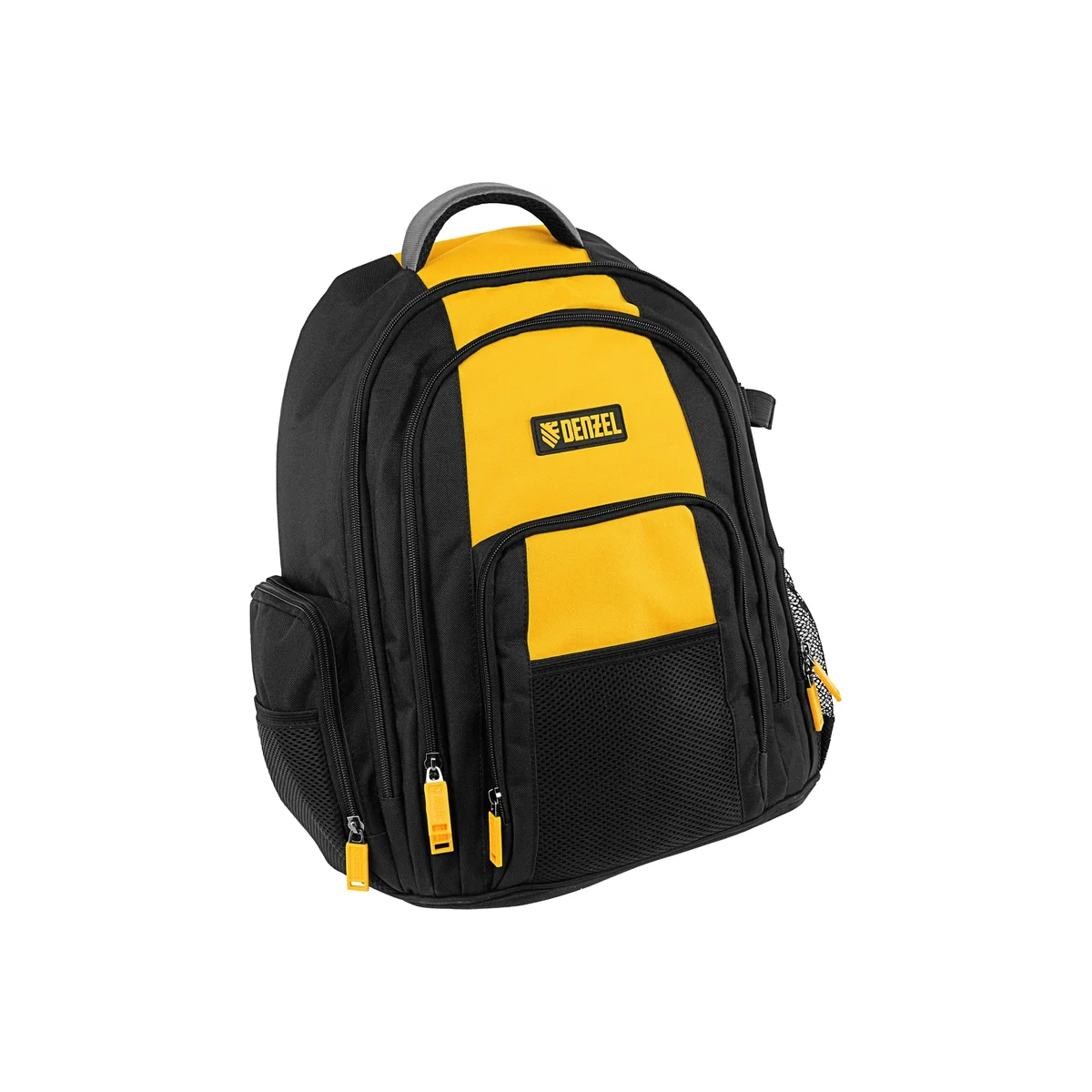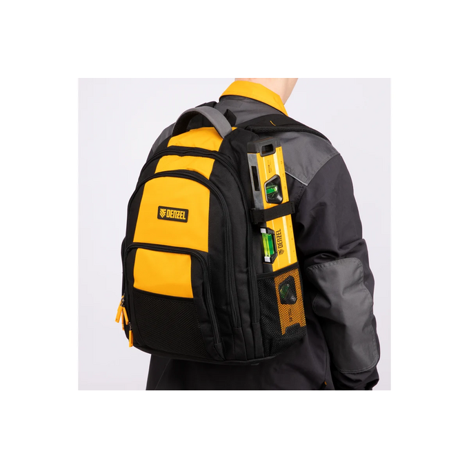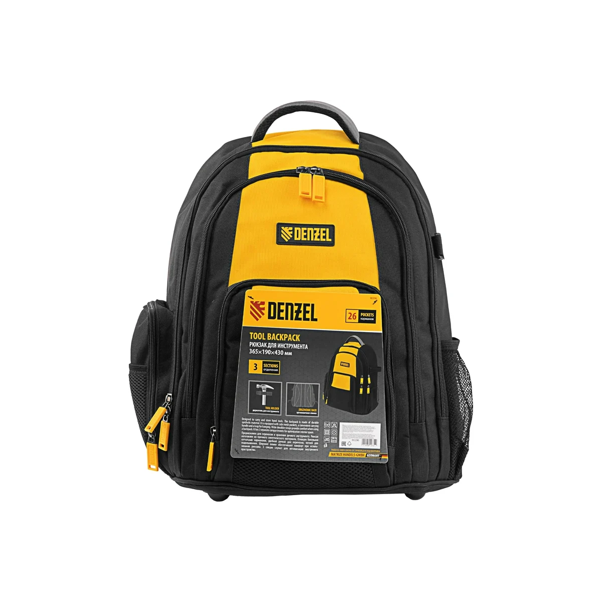 Рюкзак Denzel 90296 размером 365 х 190 х 430 мм, с 3 отделениями и 26 карманами (в том числе сетчатыми), предназначен для размещения и транспортировки ручного инструмента. 3 секции позволяют организовать упорядоченное хранение всех необходимых предметов. Рюкзак пригодится выездному мастеру.