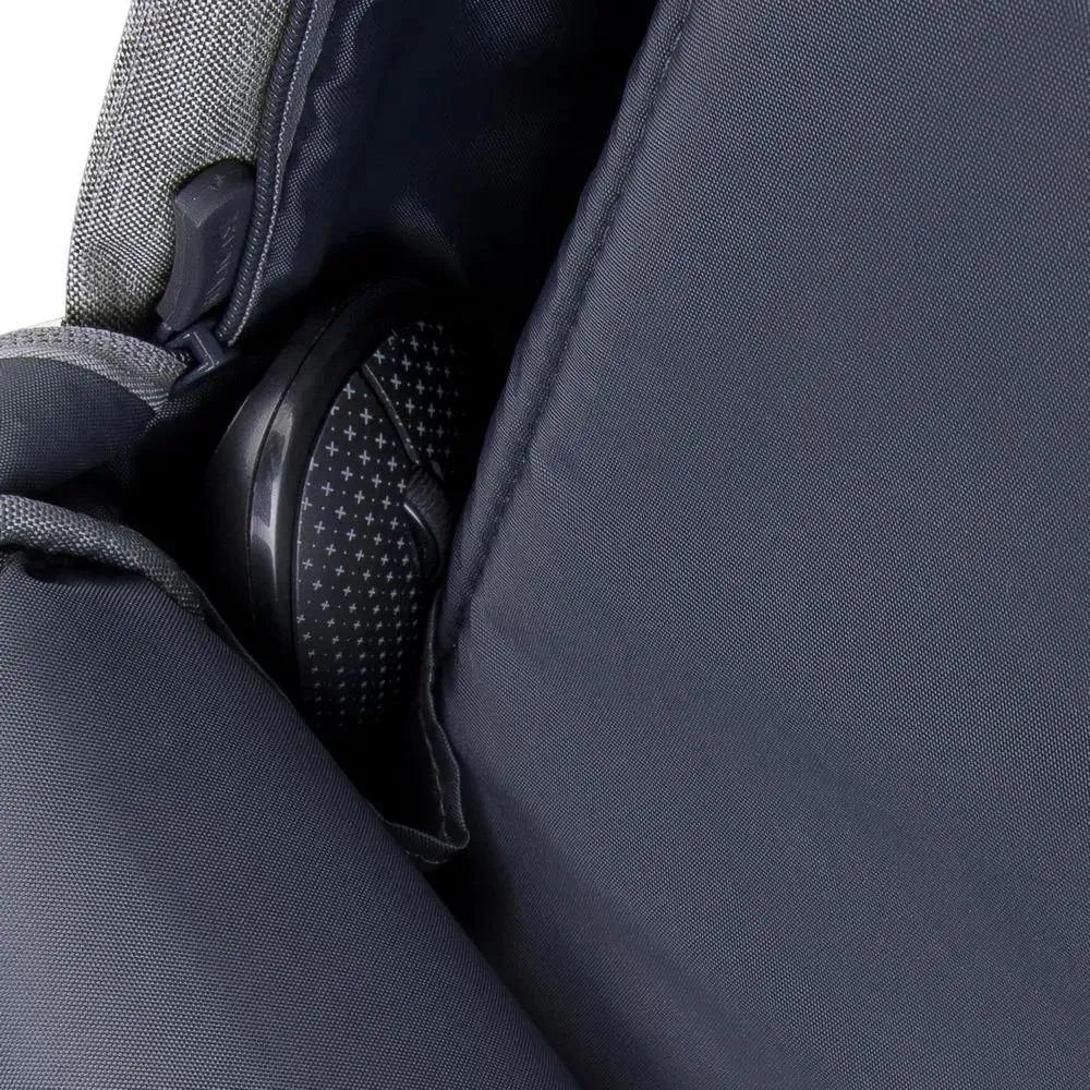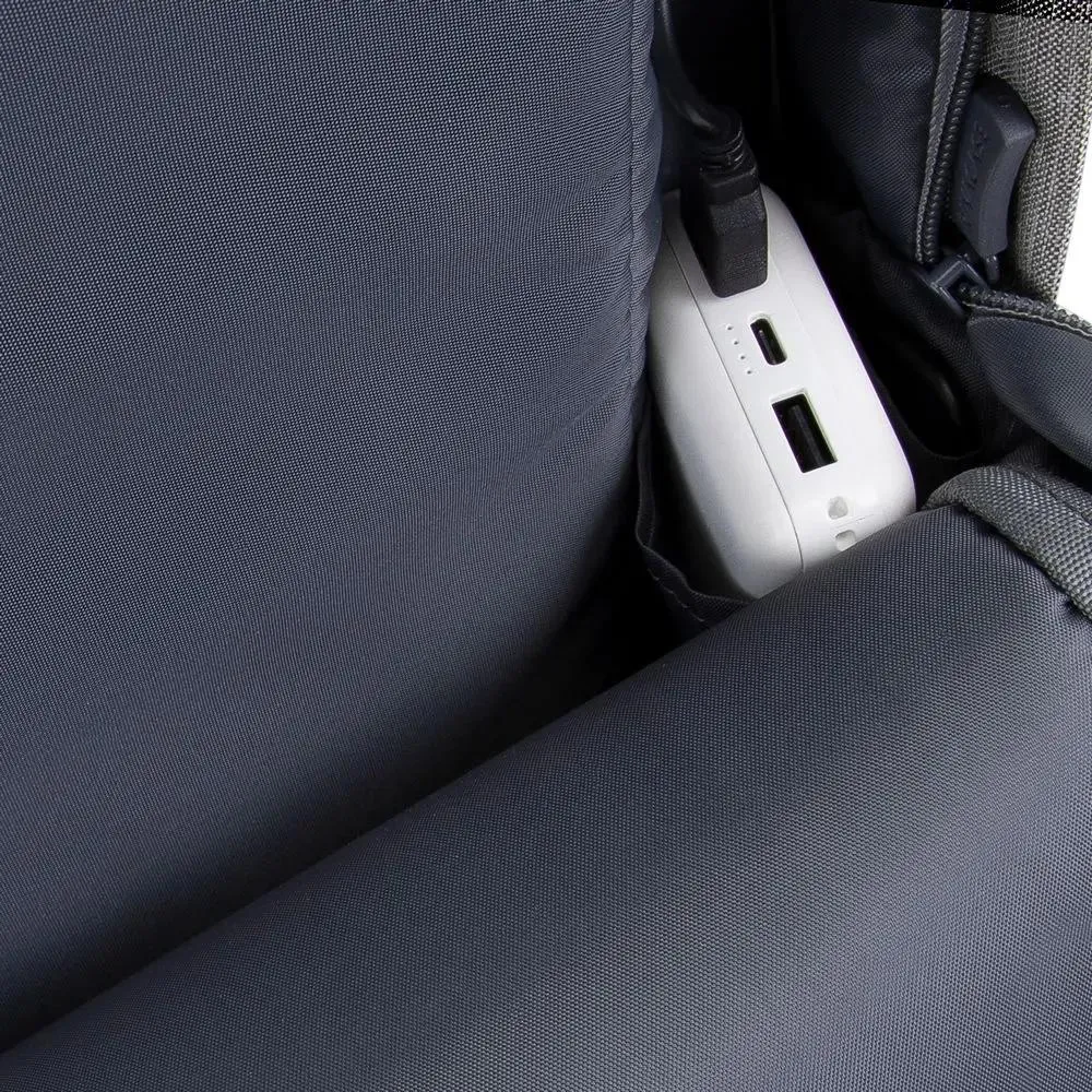 Просторное основное отделение имеет карман на молнии для паспорта и бумажника и два кармана на дне рюкзака - один для мыши, второй для повербанка. На боковой стороне рюкзака имеется USB-порт для подключения портативного внешнего аккумулятора к смартфону.