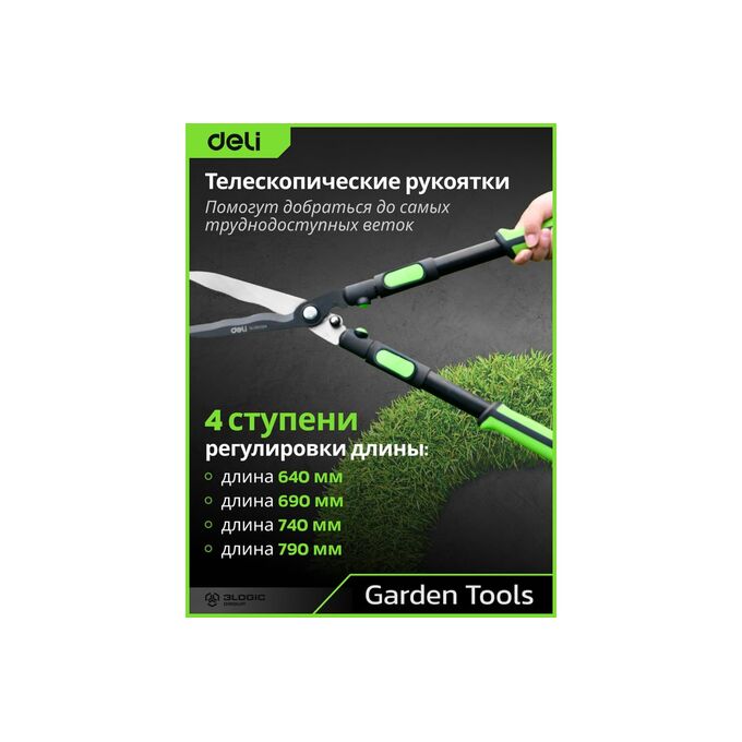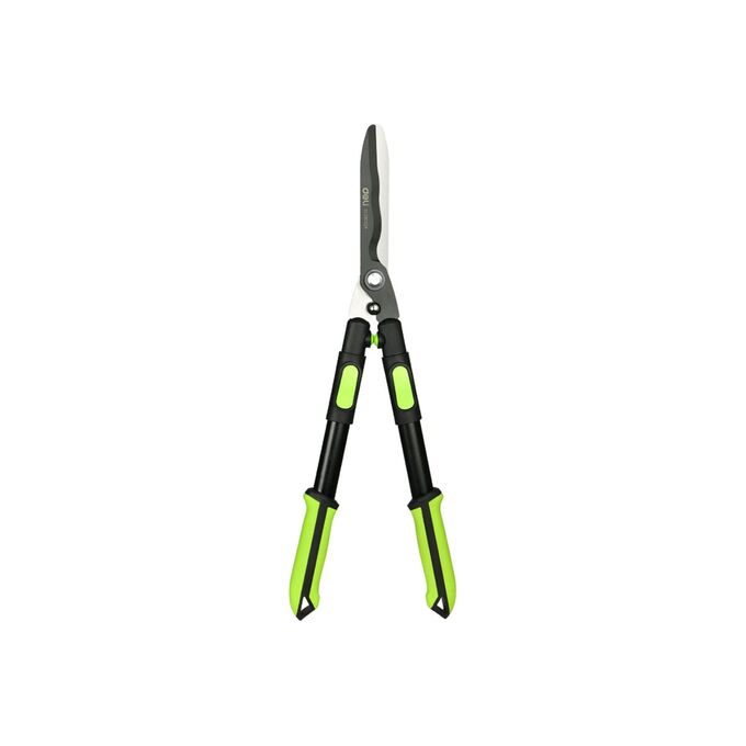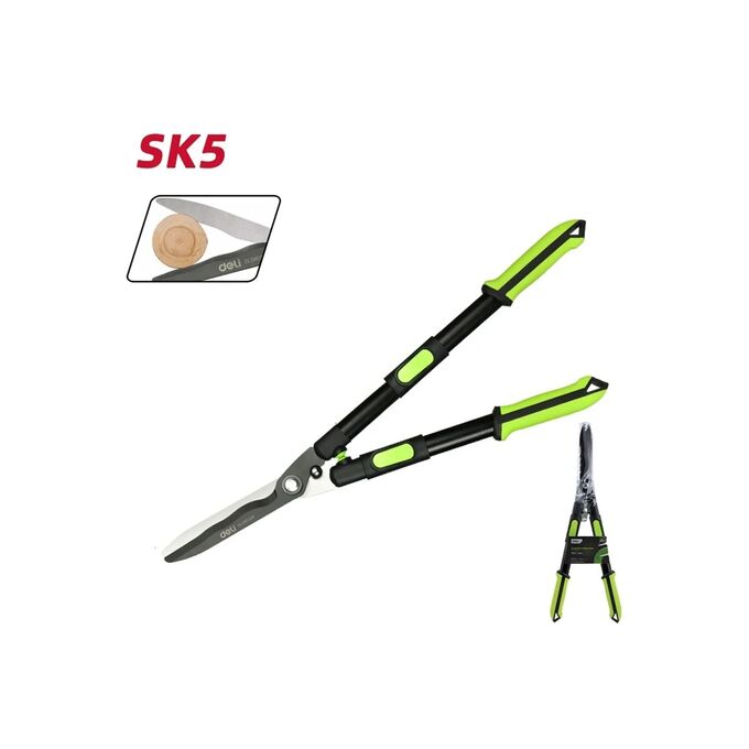 Телескопические рукоятки ножниц Deli DL580324 имеют четыре ступени регулировки длины, что делает их универсальными для пользователей различного роста и удобными для работы в труднодоступных местах.: