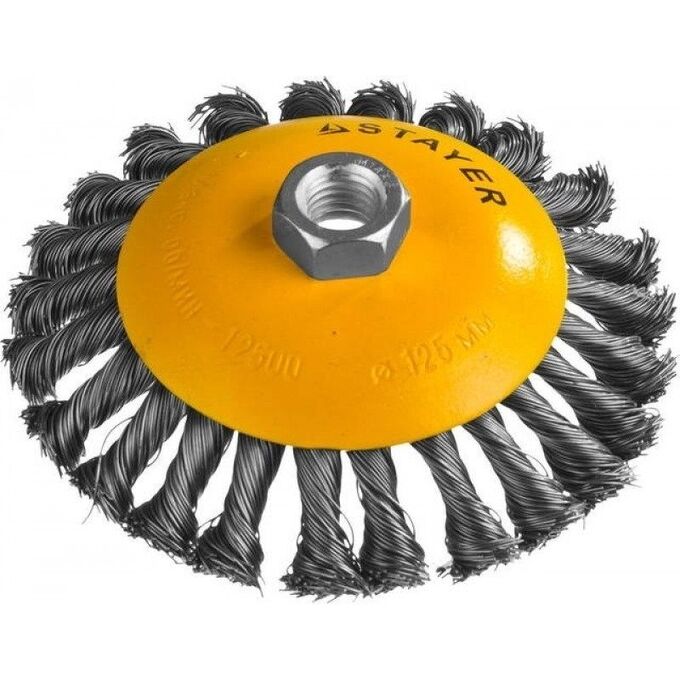 Описание Щетка STAYER 35135-125 "PROFESSIONAL" коническая с посадочным М14, плетёные пучки проволоки 0.5мм